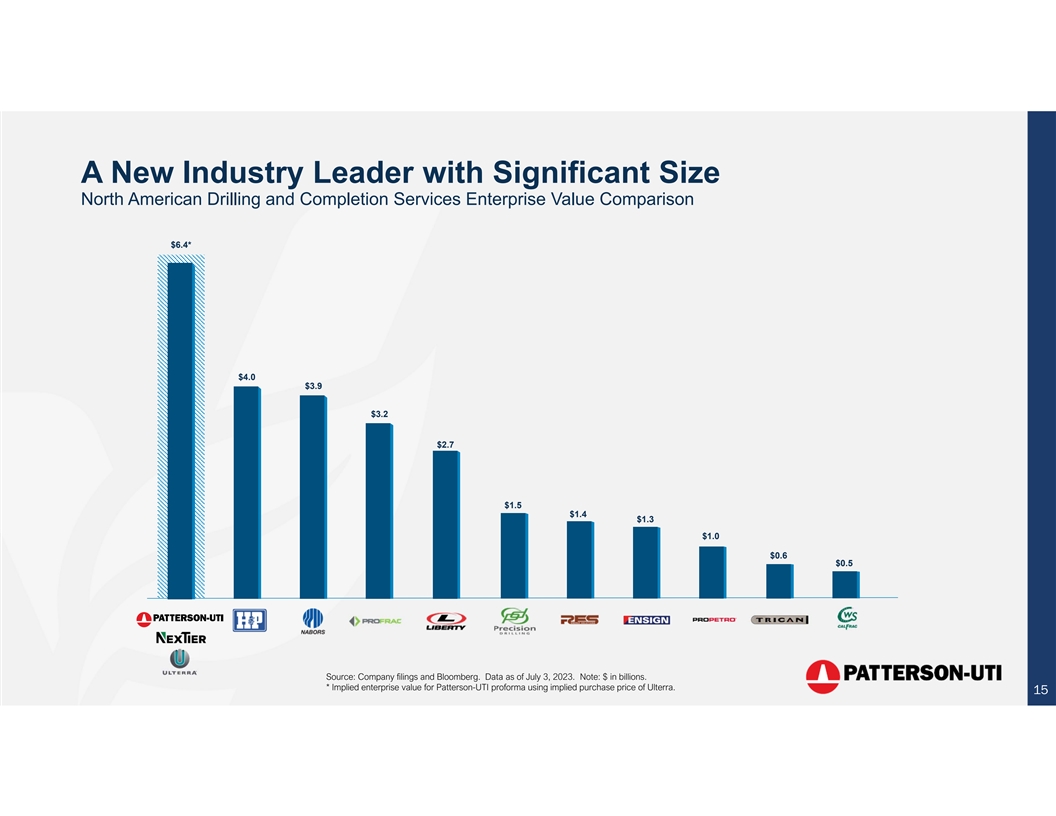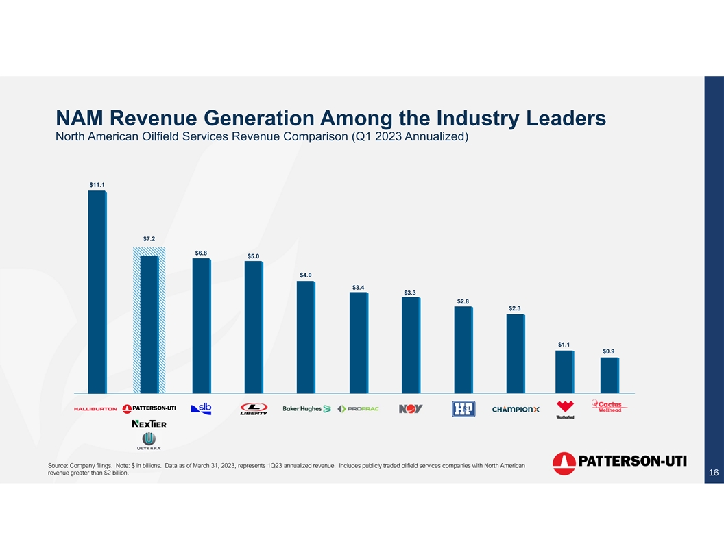 A New Industry Leader with Significant Size North American Drilling and Completion Services Enterprise Value Comparison $6.4* $4.0 $3.9 $3.2 $2.7 $1.5 $1.4 $1.3 $1.0 $0.6 $0.5 Source: Company filings and Bloomberg. Data as of July 3, 2023. Note: $ in billions. * Implied enterprise value for Patterson-UTI proforma using implied purchase price of Ulterra. 15