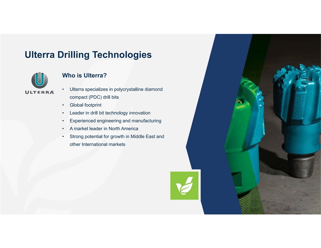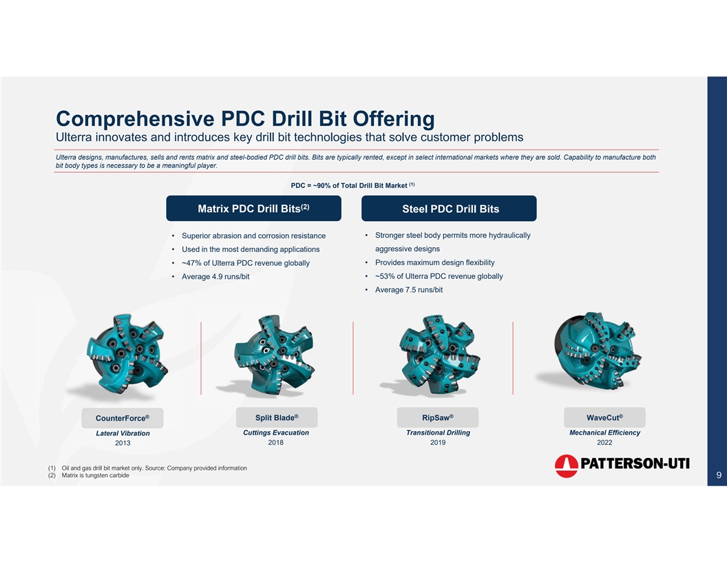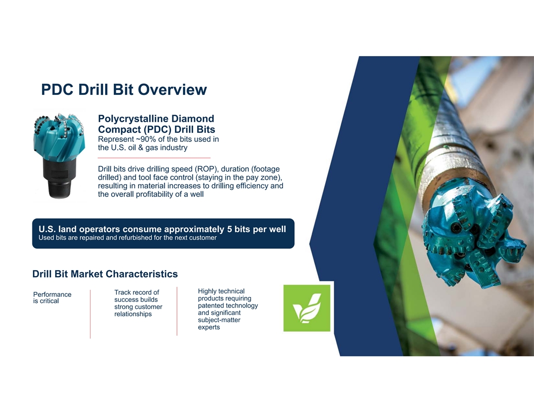 PDC Drill Bit Overview Polycrystalline Diamond Compact (PDC) Drill Bits Represent ~90% of the bits used in the U.S. oil & gas industry Drill bits drive drilling speed (ROP), duration (footage drilled) and tool face control (staying in the pay zone), resulting in material increases to drilling efficiency and the overall profitability of a well U.S. land operators consume approximately 5 bits per well Used bits are repaired and refurbished for the next customer Drill Bit Market Characteristics Highly technical Track record of Performance products requiring success builds is critical patented technology strong customer and significant relationships subject-matter experts