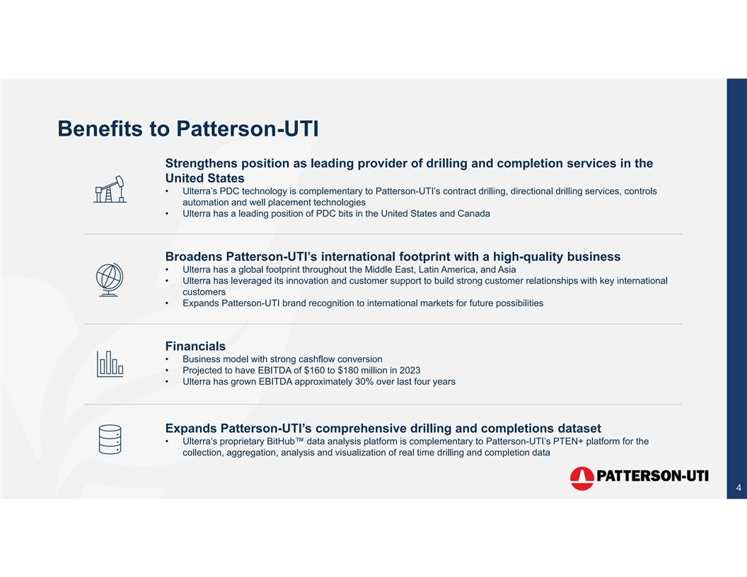 Ulterra Drilling Technologies Who is Ulterra? • Ulterra specializes in polycrystalline diamond compact (PDC) drill bits • Global footprint • Leader in drill bit technology innovation • Experienced engineering and manufacturing • A market leader in North America • Strong potential for growth in Middle East and other International markets 3