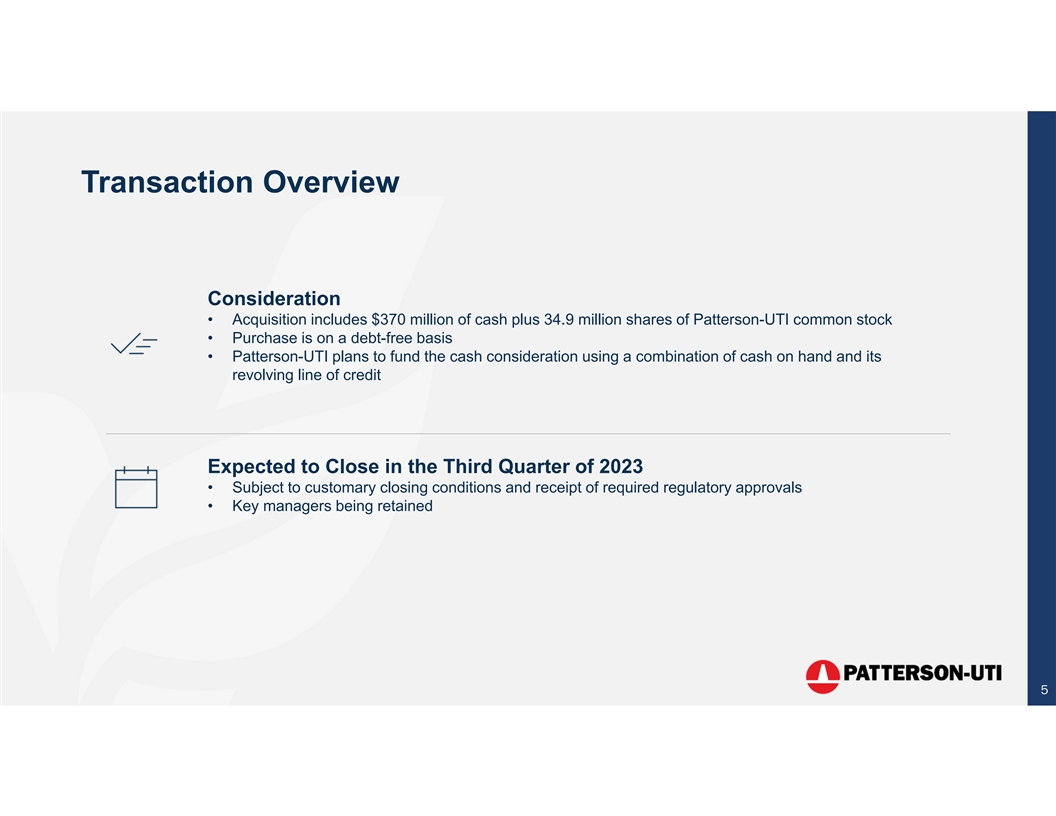 Benefits to Patterson-UTI Strengthens position as leading provider of drilling and completion services in the United States • Ulterra’s PDC technology is complementary to Patterson-UTI’s contract drilling, directional drilling services, controls automation and well placement technologies • Ulterra has a leading position of PDC bits in the United States and Canada Broadens Patterson-UTI’s international footprint with a high-quality business • Ulterra has a global footprint throughout the Middle East, Latin America, and Asia • Ulterra has leveraged its innovation and customer support to build strong customer relationships with key international customers • Expands Patterson-UTI brand recognition to international markets for future possibilities Financials • Business model with strong cashflow conversion • Projected to have EBITDA of $160 to $180 million in 2023 • Ulterra has grown EBITDA approximately 30% over last four years Expands Patterson-UTI’s comprehensive drilling and completions dataset • Ulterra’s proprietary BitHub™ data analysis platform is complementary to Patterson-UTI’s PTEN+ platform for the collection, aggregation, analysis and visualization of real time drilling and completion data 4