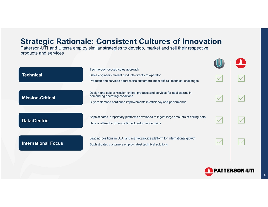 Transaction Overview Consideration • Acquisition includes $370 million of cash plus 34.9 million shares of Patterson-UTI common stock • Purchase is on a debt-free basis • Patterson-UTI plans to fund the cash consideration using a combination of cash on hand and its revolving line of credit Expected to Close in the Third Quarter of 2023 • Subject to customary closing conditions and receipt of required regulatory approvals • Key managers being retained 5