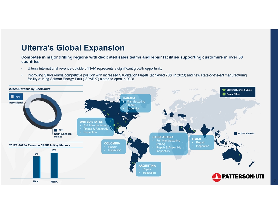 Strategic Rationale: Consistent Cultures of Innovation Patterson-UTI and Ulterra employ similar strategies to develop, market and sell their respective products and services Technology-focused sales approach Sales engineers market products directly to operator Technical Products and services address the customers’ most difficult technical challenges Design and sale of mission-critical products and services for applications in demanding operating conditions Mission-Critical Buyers demand continued improvements in efficiency and performance Sophisticated, proprietary platforms developed to ingest large amounts of drilling data Data-Centric Data is utilized to drive continued performance gains Leading positions in U.S. land market provide platform for international growth International Focus Sophisticated customers employ latest technical solutions 6