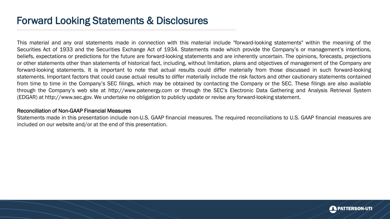 This material and any oral statements made in connection with this material include "forward-looking statements" within the meaning of the Securities Act of 1933 and the Securities Exchange Act of 1934. Statements made which provide the Company’s or management’s intentions, beliefs, expectations or predictions for the future are forward-looking statements and are inherently uncertain. The opinions, forecasts, projections or other statements other than statements of historical fact, including, without limitation, plans and objectives of management of the Company are forward-looking statements. It is important to note that actual results could differ materially from those discussed in such forward-looking statements. Important factors that could cause actual results to differ materially include the risk factors and other cautionary statements contained from time to time in the Company’s SEC filings, which may be obtained by contacting the Company or the SEC. These filings are also available through the Company’s web site at http://www.patenergy.com or through the SEC’s Electronic Data Gathering and Analysis Retrieval System (EDGAR) at http://www.sec.gov. We undertake no obligation to publicly update or revise any forward-looking statement. Reconciliation of Non-GAAP Financial Measures Statements made in this presentation include non-U.S. GAAP financial measures. The required reconciliations to U.S. GAAP financial measures are included on our website and/or at the end of this presentation. Forward Looking Statements & Disclosures
