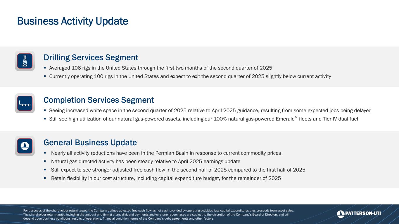 Business Activity Update For purposes of the shareholder return target, the Company defines adjusted free cash flow as net cash provided by operating activities less capital expenditures plus proceeds from asset sales. The shareholder return target, including the amount and timing of any dividend payments and/or share repurchases are subject to the discretion of the Company’s Board of Directors and will depend upon business conditions, results of operations, financial condition, terms of the Company’s debt agreements and other factors. Drilling Services Segment ▪ Averaged 106 rigs in the United States through the first two months of the second quarter of 2025 ▪ Currently operating 100 rigs in the United States and expect to exit the second quarter of 2025 slightly below current activity Completion Services Segment ▪ Seeing increased white space in the second quarter of 2025 relative to April 2025 guidance, resulting from some expected jobs being delayed ▪ Still see high utilization of our natural gas-powered assets, including our 100% natural gas-powered Emerald fleets and Tier IV dual fuel General Business Update ▪ Nearly all activity reductions have been in the Permian Basin in response to current commodity prices ▪ Natural gas directed activity has been steady relative to April 2025 earnings update ▪ Still expect to see stronger adjusted free cash flow in the second half of 2025 compared to the first half of 2025 ▪ Retain flexibility in our cost structure, including capital expenditure budget, for the remainder of 2025