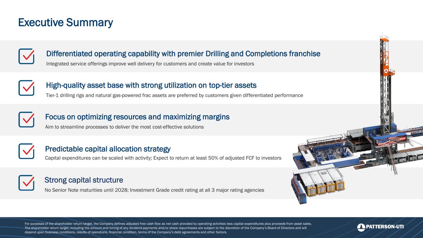 Differentiated operating capability with premier Drilling and Completions franchise Integrated service offerings improve well delivery for customers and create value for investors Predictable capital allocation strategy Capital expenditures can be scaled with activity; Expect to return at least 50% of adjusted FCF to investors Focus on optimizing resources and maximizing margins Aim to streamline processes to deliver the most cost-effective solutions Strong capital structure No Senior Note maturities until 2028; Investment Grade credit rating at all 3 major rating agencies Executive Summary High-quality asset base with strong utilization on top-tier assets Tier-1 drilling rigs and natural gas-powered frac assets are preferred by customers given differentiated performance For purposes of the shareholder return target, the Company defines adjusted free cash flow as net cash provided by operating activities less capital expenditures plus proceeds from asset sales. The shareholder return target, including the amount and timing of any dividend payments and/or share repurchases are subject to the discretion of the Company’s Board of Directors and will depend upon business conditions, results of operations, financial condition, terms of the Company’s debt agreements and other factors.