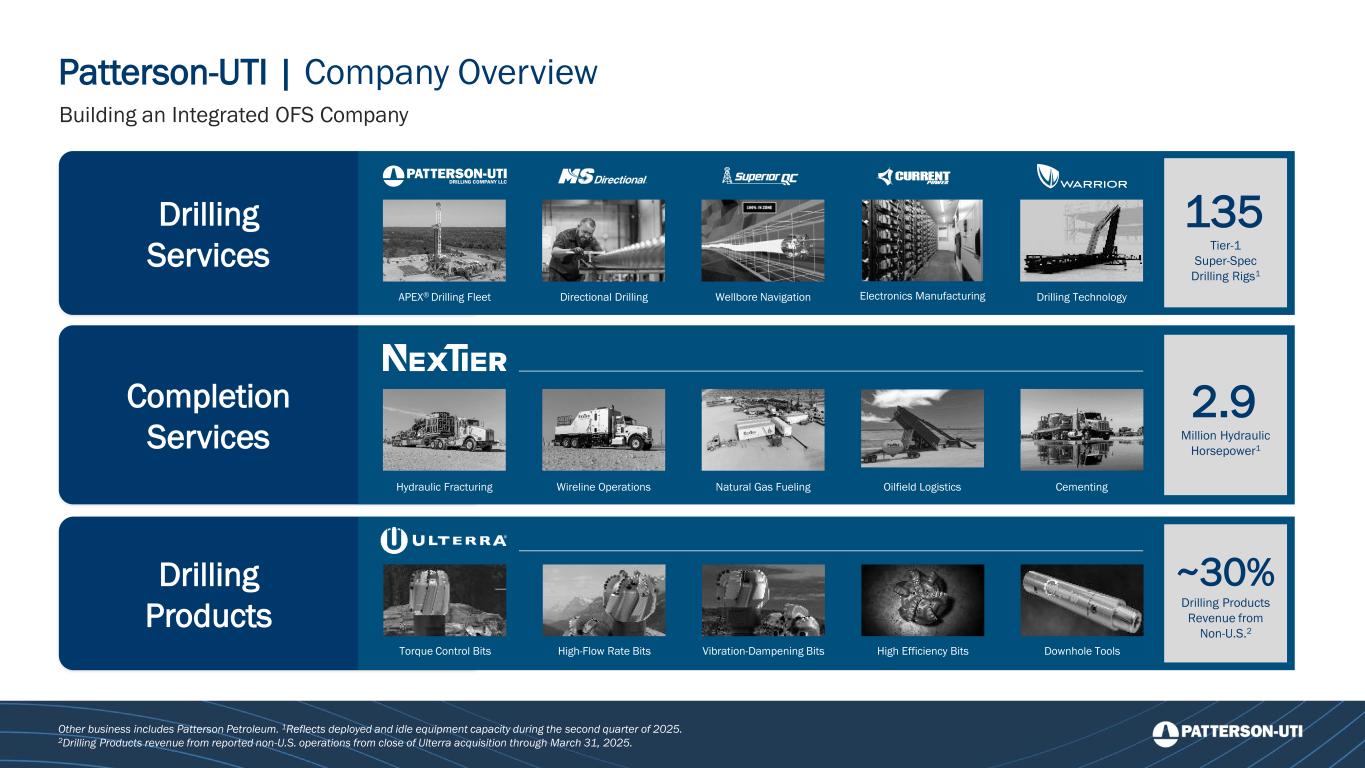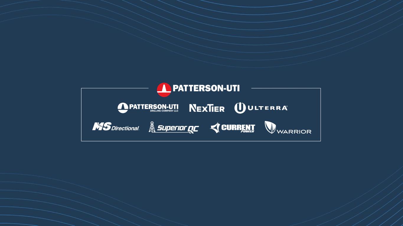 Hydraulic Fracturing Wireline Operations Natural Gas Fueling Oilfield Logistics Cementing 2.9 Million Hydraulic Horsepower1 Other business includes Patterson Petroleum. 1Reflects deployed and idle equipment capacity during the second quarter of 2025. 2Drilling Products revenue from reported non-U.S. operations from close of Ulterra acquisition through March 31, 2025. 135 Tier-1 Super-Spec Drilling Rigs1 APEX® Drilling Fleet Wellbore Navigation Drilling TechnologyElectronics ManufacturingDirectional Drilling Torque Control Bits High-Flow Rate Bits Vibration-Dampening Bits High Efficiency Bits Downhole Tools ~30% Drilling Products Revenue from Non-U.S.2 Patterson-UTI | Company Overview Building an Integrated OFS Company Drilling Services Completion Services Drilling Products