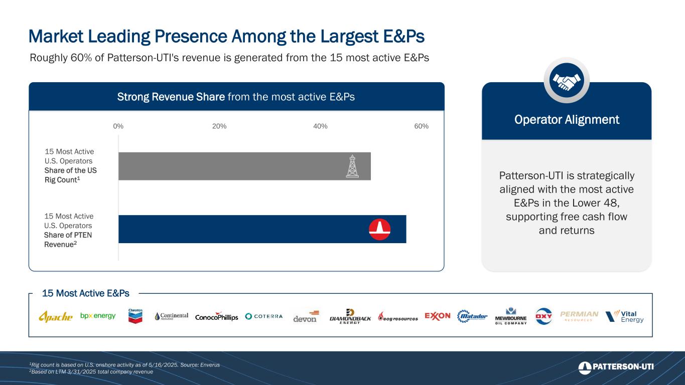 Market Leading Presence Among the Largest E&Ps Roughly 60% of Patterson-UTI's revenue is generated from the 15 most active E&Ps 1Rig count is based on U.S. onshore activity as of 5/16/2025. Source: Enverus 2Based on LTM 3/31/2025 total company revenue 15 Most Active E&Ps 0% 20% 40% 60% 15 Most Active U.S. Operators Share of the US Rig Count1 15 Most Active U.S. Operators Share of PTEN Revenue2 Operator Alignment Strong Revenue Share from the most active E&Ps Patterson-UTI is strategically aligned with the most active E&Ps in the Lower 48, supporting free cash flow and returns