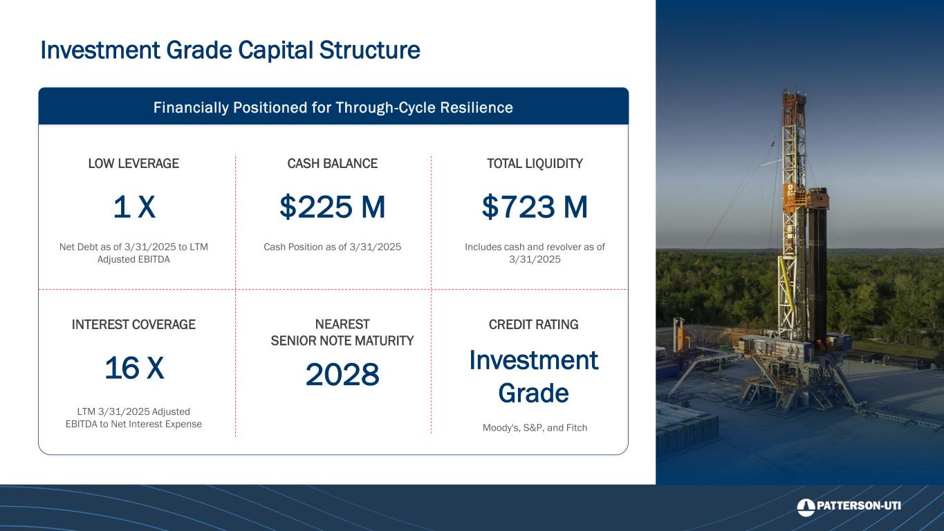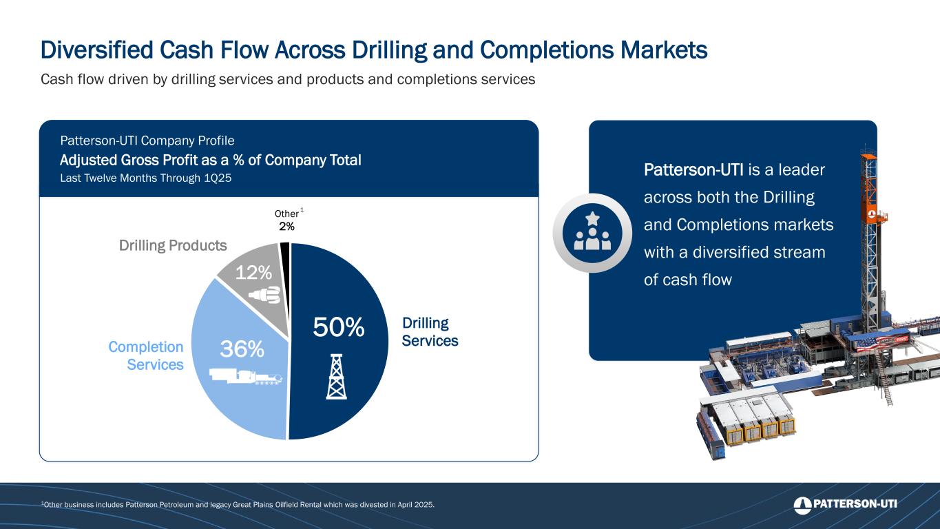 Diversified Cash Flow Across Drilling and Completions Markets 1Other business includes Patterson Petroleum and legacy Great Plains Oilfield Rental which was divested in April 2025. Cash flow driven by drilling services and products and completions services Patterson-UTI Company Profile Adjusted Gross Profit as a % of Company Total Last Twelve Months Through 1Q25 Drilling ServicesCompletion Services Drilling Products Other 2% 50% 12% 36% 1 Patterson-UTI is a leader across both the Drilling and Completions markets with a diversified stream of cash flow