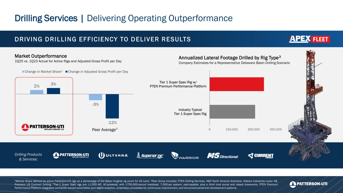 Drilling Products & Services: DRIVING DRILL ING EFFICIENCY TO DEL IVER RESULTS Annualized Lateral Footage Drilled by Rig Type3 Company Estimates for a Representative Delaware Basin Drilling Scenario Market Outperformance 1Q25 vs. 1Q23 Actual for Active Rigs and Adjusted Gross Profit per Day 0 150,000 300,000 450,000 Industry Typical Tier 1 Super Spec Rig Tier 1 Super Spec Rig w/ PTEN Premium Performance Platform Drilling Services | Delivering Operating Outperformance 1Market Share defined as active Patterson-UTI rigs as a percentage of the Baker Hughes rig count for US Land. 2Peer Group Includes: PTEN Drilling Services, H&P North America Solutions, Nabors Industries Lower 48, Precision US Contract Drilling. 3Tier-1 Super Spec rigs are ≥1,500 HP, AC-powered, with ≥750,000-pound hookload, 7,500-psi system, pad-capable, plus a third mud pump and raised drawworks. PTEN Premium Performance Platform integrates contractor-owned automation and digital analytics, proprietary processes for continuous improvement, and structured personnel development systems. 2% -3% 3% -12% Patterson-UTI Drilling Peer Average Change in Market Share Change in Adjusted Gross Profit per Day 2 1