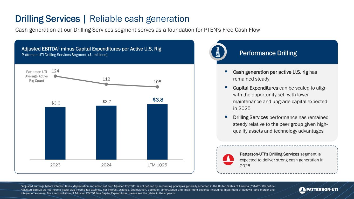 Drilling Services | Reliable cash generation Adjusted EBITDA1 minus Capital Expenditures per Active U.S. Rig Patterson-UTI Drilling Services Segment, ($, millions) Cash generation at our Drilling Services segment serves as a foundation for PTEN's Free Cash Flow 1Adjusted earnings before interest, taxes, depreciation and amortization (“Adjusted EBITDA”) is not defined by accounting principles generally accepted in the United States of America (“GAAP”). We define Adjusted EBITDA as net income (loss) plus income tax expense, net interest expense, depreciation, depletion, amortization and impairment expense (including impairment of goodwill) and merger and integration expense. For a reconciliation of Adjusted EBITDA less Capital Expenditures, please see the tables in the appendix. $3.6 $3.7 $3.8 124 112 108 2023 2024 LTM 1Q25 Patterson-UTI Average Active Rig Count Performance Drilling ▪ Cash generation per active U.S. rig has remained steady ▪ Capital Expenditures can be scaled to align with the opportunity set, with lower maintenance and upgrade capital expected in 2025 ▪ Drilling Services performance has remained steady relative to the peer group given high- quality assets and technology advantages Patterson-UTI’s Drilling Services segment is expected to deliver strong cash generation in 2025