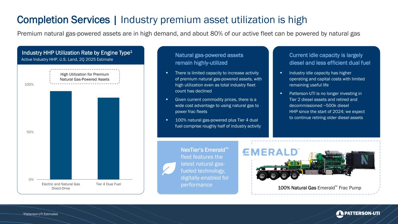 Industry HHP Utilization Rate by Engine Type1 Active Industry HHP, U.S. Land, 2Q 2025 Estimate 0% 50% 100% Electric and Natural Gas Direct-Drive Tier 4 Dual Fuel High Utilization for Premium Natural Gas-Powered Assets Premium natural gas-powered assets are in high demand, and about 80% of our active fleet can be powered by natural gas 1Patterson-UTI Estimates Completion Services | Industry premium asset utilization is high 100% Natural Gas Emerald Frac Pump NexTier’s Emerald fleet features the latest natural gas- fueled technology, digitally-enabled for performance ▪ There is limited capacity to increase activity of premium natural gas-powered assets, with high utilization even as total industry fleet count has declined ▪ Given current commodity prices, there is a wide cost advantage to using natural gas to power frac fleets ▪ 100% natural gas-powered plus Tier 4 dual fuel comprise roughly half of industry activity Natural gas-powered assets remain highly-utilized ▪ Industry idle capacity has higher operating and capital costs with limited remaining useful life ▪ Patterson-UTI is no longer investing in Tier 2 diesel assets and retired and decommissioned ~500k diesel HHP since the start of 2024; we expect to continue retiring older diesel assets Current idle capacity is largely diesel and less efficient dual fuel