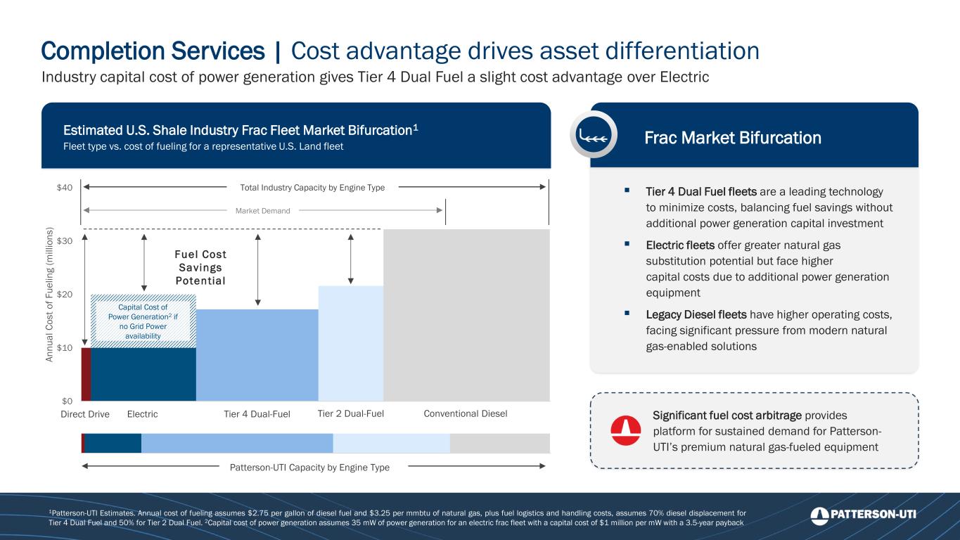 Completion Services | Cost advantage drives asset differentiation Estimated U.S. Shale Industry Frac Fleet Market Bifurcation1 Fleet type vs. cost of fueling for a representative U.S. Land fleet 1Patterson-UTI Estimates. Annual cost of fueling assumes $2.75 per gallon of diesel fuel and $3.25 per mmbtu of natural gas, plus fuel logistics and handling costs, assumes 70% diesel displacement for Tier 4 Dual Fuel and 50% for Tier 2 Dual Fuel. 2Capital cost of power generation assumes 35 mW of power generation for an electric frac fleet with a capital cost of $1 million per mW with a 3.5-year payback Industry capital cost of power generation gives Tier 4 Dual Fuel a slight cost advantage over Electric Direct Drive Electric Tier 4 Dual-Fuel Tier 2 Dual-Fuel Conventional Diesel $0 $10 $20 $30 $40 A n n u a l C o s t o f F u e li n g ( m il li o n s ) Patterson-UTI Capacity by Engine Type Fuel Cost Savings Potentia l Market Demand Total Industry Capacity by Engine Type Capital Cost of Power Generation2 if no Grid Power availability Frac Market Bifurcation ▪ Tier 4 Dual Fuel fleets are a leading technology to minimize costs, balancing fuel savings without additional power generation capital investment ▪ Electric fleets offer greater natural gas substitution potential but face higher capital costs due to additional power generation equipment ▪ Legacy Diesel fleets have higher operating costs, facing significant pressure from modern natural gas-enabled solutions Significant fuel cost arbitrage provides platform for sustained demand for Patterson- UTI’s premium natural gas-fueled equipment