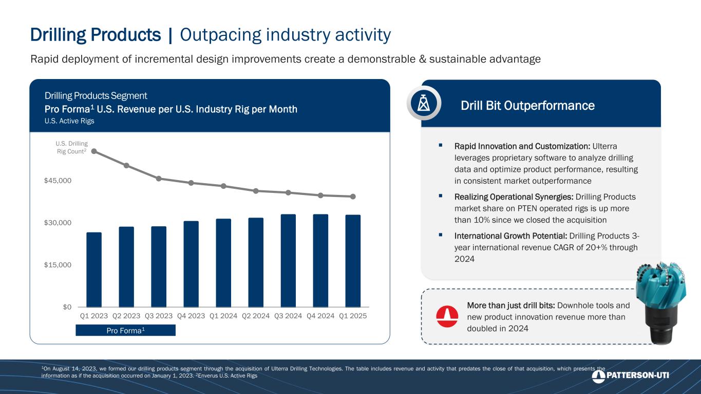 Drilling Products | Outpacing industry activity Rapid deployment of incremental design improvements create a demonstrable & sustainable advantage 1On August 14, 2023, we formed our drilling products segment through the acquisition of Ulterra Drilling Technologies. The table includes revenue and activity that predates the close of that acquisition, which presents the information as if the acquisition occurred on January 1, 2023. 2Enverus U.S. Active Rigs Drill Bit Outperformance More than just drill bits: Downhole tools and new product innovation revenue more than doubled in 2024 ▪ Rapid Innovation and Customization: Ulterra leverages proprietary software to analyze drilling data and optimize product performance, resulting in consistent market outperformance ▪ Realizing Operational Synergies: Drilling Products market share on PTEN operated rigs is up more than 10% since we closed the acquisition ▪ International Growth Potential: Drilling Products 3- year international revenue CAGR of 20+% through 2024 0 100 200 300 400 500 600 700 800 900 $0 $15,000 $30,000 $45,000 $60,000 Q1 2023 Q2 2023 Q3 2023 Q4 2023 Q1 2024 Q2 2024 Q3 2024 Q4 2024 Q1 2025 Pro Forma1 Drilling Products Segment Pro Forma1 U.S. Revenue per U.S. Industry Rig per Month U.S. Active Rigs U.S. Drilling Rig Count2