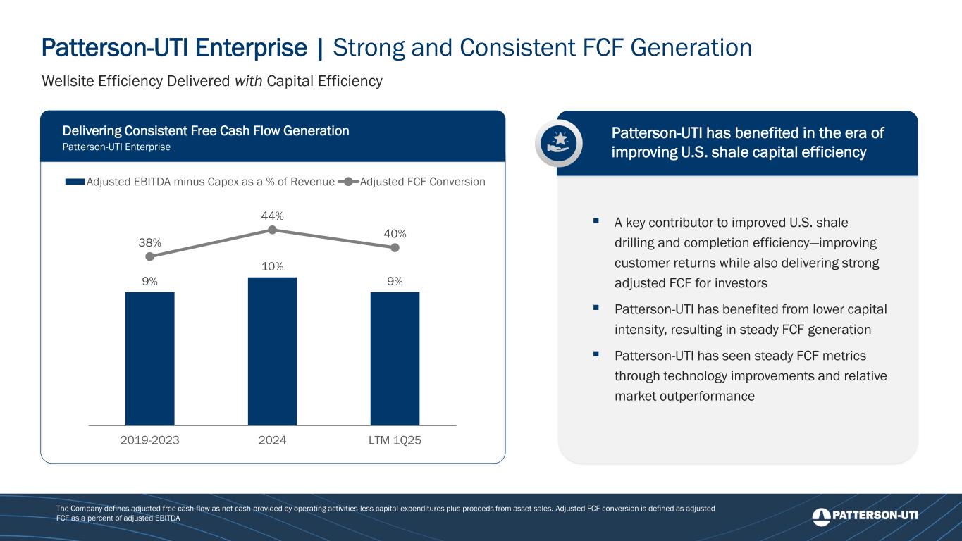 9% 10% 9% 38% 44% 40% 0% $- 2019-2023 2024 LTM 1Q25 Adjusted EBITDA minus Capex as a % of Revenue Adjusted FCF Conversion Patterson-UTI Enterprise | Strong and Consistent FCF Generation Patterson-UTI has benefited in the era of improving U.S. shale capital efficiency ▪ A key contributor to improved U.S. shale drilling and completion efficiency—improving customer returns while also delivering strong adjusted FCF for investors ▪ Patterson-UTI has benefited from lower capital intensity, resulting in steady FCF generation ▪ Patterson-UTI has seen steady FCF metrics through technology improvements and relative market outperformance Wellsite Efficiency Delivered with Capital Efficiency Delivering Consistent Free Cash Flow Generation Patterson-UTI Enterprise The Company defines adjusted free cash flow as net cash provided by operating activities less capital expenditures plus proceeds from asset sales. Adjusted FCF conversion is defined as adjusted FCF as a percent of adjusted EBITDA