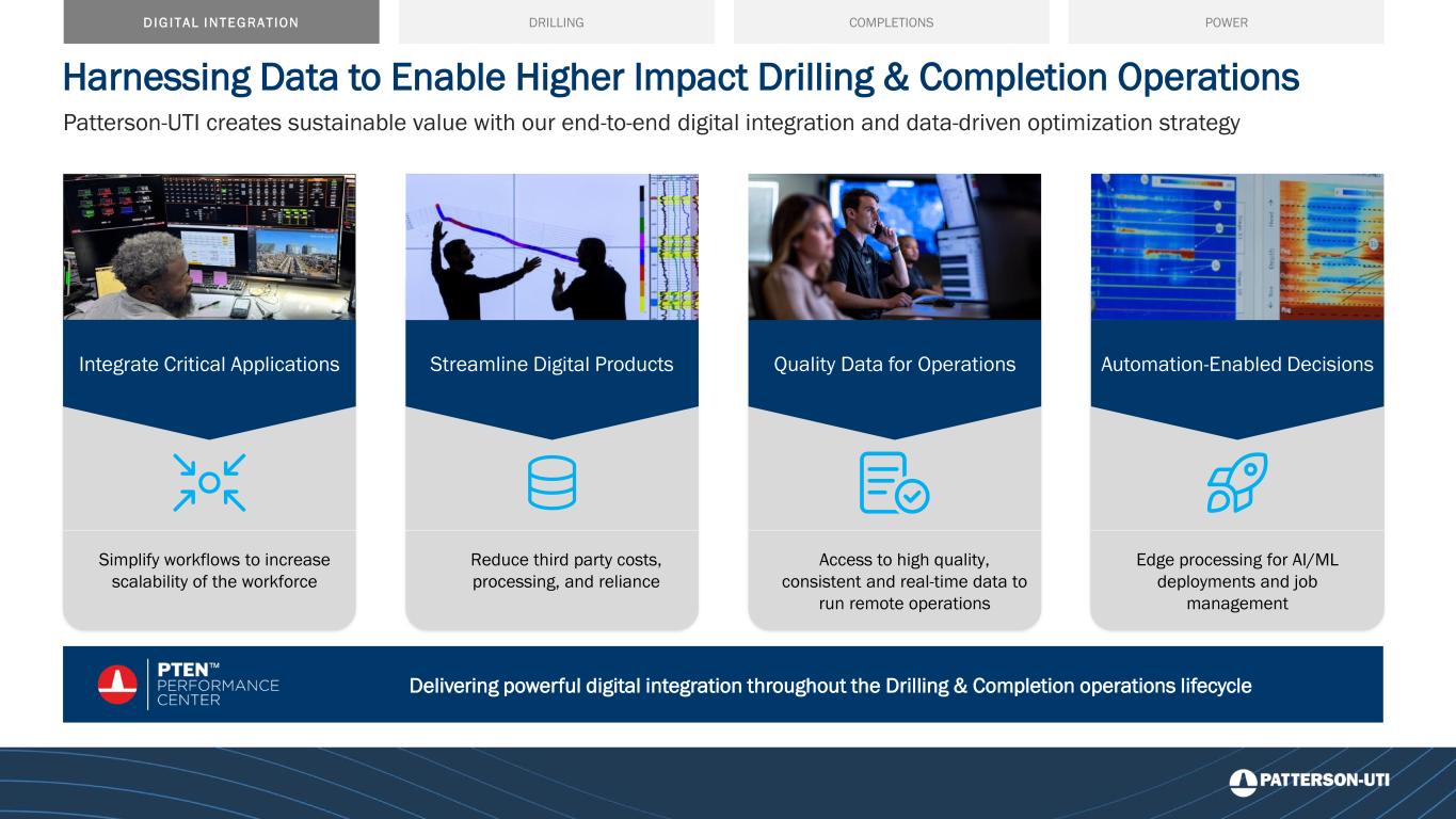 Harnessing Data to Enable Higher Impact Drilling & Completion Operations DRILLING COMPLETIONS POWERDIG ITAL INTEGRATION Patterson-UTI creates sustainable value with our end-to-end digital integration and data-driven optimization strategy Simplify workflows to increase scalability of the workforce Access to high quality, consistent and real-time data to run remote operations Edge processing for AI/ML deployments and job management Reduce third party costs, processing, and reliance Integrate Critical Applications Streamline Digital Products Quality Data for Operations Automation-Enabled Decisions Delivering powerful digital integration throughout the Drilling & Completion operations lifecycle