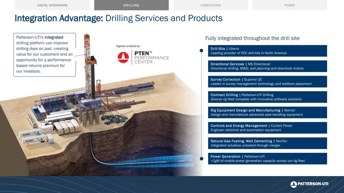 Integration Advantage: Drilling Services and Products Contract Drilling | Patterson-UTI Drilling Diverse rig fleet complete with innovative software solutions Natural Gas Fueling, Well Cementing | NexTier Integrated solutions unlocked through merger Drill Bits | Ulterra Leading provider of PDC drill bits in North America Directional Services | MS Directional Directional drilling, MWD, well planning and downhole motors Survey Correction | Superior QC Leader in survey management technology and wellbore placement Power Generation | Patterson-UTI >1gW of mobile power generation capacity across our rig fleet Patterson-UTI's integrated drilling platform can improve drilling days on pad, creating value for our customers and an opportunity for a performance- based returns premium for our investors. Controls and Energy Management | Current Power Engineer electrical and automation equipment Rig Equipment Design and Manufacturing | Warrior Design and manufacture advanced pipe-handling equipment Fully integrated throughout the drill site Digitally enabled by: DRILLING COMPLETIONS POWERDIGITAL INTEGRATION