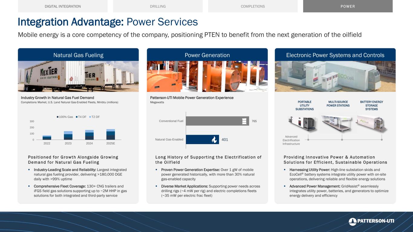 Natural Gas Fueling Mobile energy is a core competency of the company, positioning PTEN to benefit from the next generation of the oilfield Pos i t ioned for Growth Alongs ide Growing Demand for Natural Gas Fuel ing ▪ Industry-Leading Scale and Reliability: Largest integrated natural gas fueling provider, delivering >180,000 DGE daily with >99% uptime ▪ Comprehensive Fleet Coverage: 130+ CNG trailers and iFGS field gas solutions supporting up to ~2M HHP in gas solutions for both integrated and third-party service 0 100 200 300 2022 2023 2024 2025E 100% Gas T4 DF T2 DF Industry Growth in Natural Gas Fuel Demand Completions Market, U.S. Land Natural Gas-Enabled Fleets, Mmbtu (millions) 401 765 Natural Gas-Enabled Conventional Fuel Patterson-UTI Mobile Power Generation Experience Megawatts Long His tory of Support ing the E lect r i f icat ion of the Oi l f ie ld ▪ Proven Power Generation Expertise: Over 1 gW of mobile power generated historically, with more than 30% natural gas-enabled capacity ▪ Diverse Market Applications: Supporting power needs across drilling rigs (~4 mW per rig) and electric completions fleets (~35 mW per electric frac fleet) Provid ing Innovat ive Power & Automation Solut ions for Ef f ic ient , Susta inable Operat ions ▪ Harnessing Utility Power: High-line substation skids and EcoCell® battery systems integrate utility power with on-site operations, delivering reliable and flexible energy solutions ▪ Advanced Power Management: GridAssist® seamlessly integrates utility power, batteries, and generators to optimize energy delivery and efficiency Advanced Electrification Infrastructure PORTABLE UTILITY SUBSTATIONS MULTI-SOURCE POWER STATIONS BATTERY ENERGY STORAGE SYSTEMS Integration Advantage: Power Services Power Generation Electronic Power Systems and Controls DRILLING COMPLETIONS POWERDIGITAL INTEGRATION