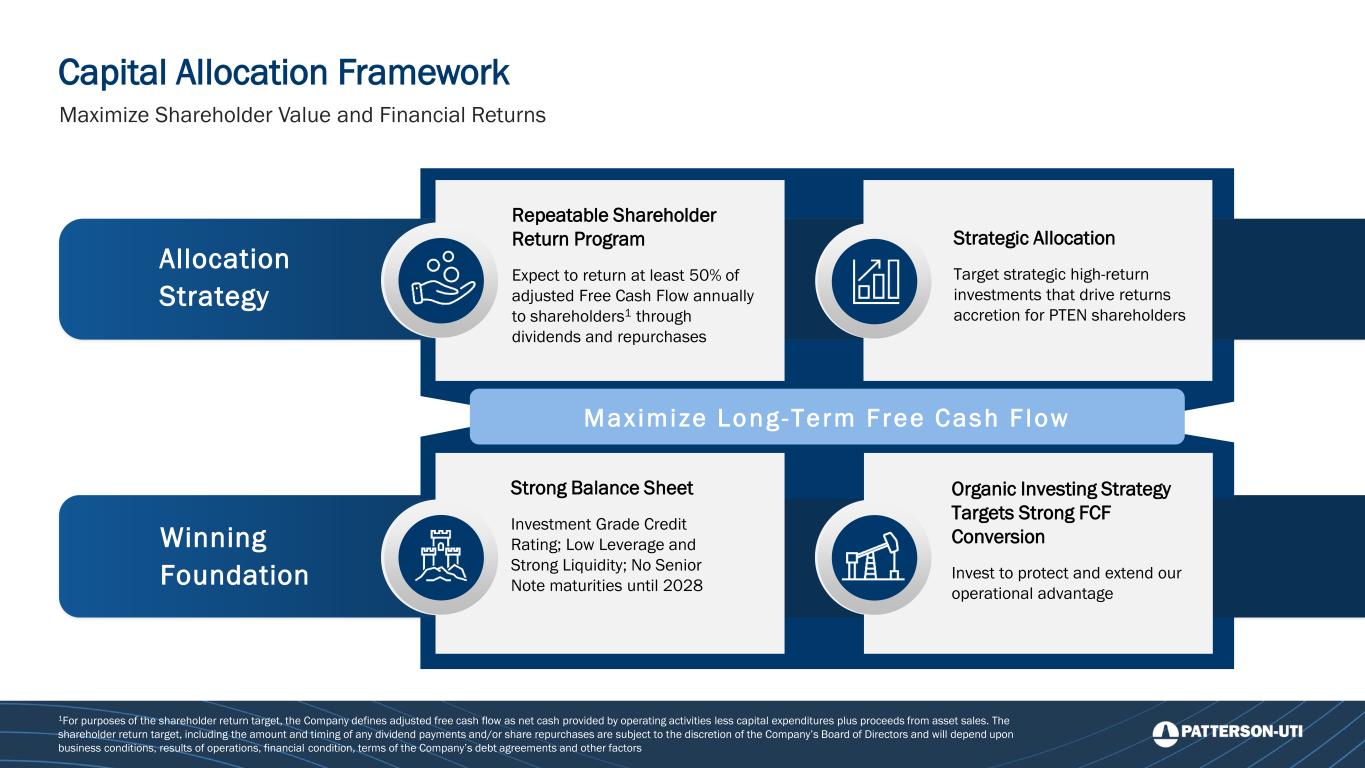 Organic Investing Strategy Targets Strong FCF Conversion Invest to protect and extend our operational advantage Strategic Allocation Target strategic high-return investments that drive returns accretion for PTEN shareholders Maximize Long -Term Free Cash F low Winning Foundation Allocation Strategy Strong Balance Sheet Investment Grade Credit Rating; Low Leverage and Strong Liquidity; No Senior Note maturities until 2028 Repeatable Shareholder Return Program Expect to return at least 50% of adjusted Free Cash Flow annually to shareholders1 through dividends and repurchases Capital Allocation Framework Maximize Shareholder Value and Financial Returns 1For purposes of the shareholder return target, the Company defines adjusted free cash flow as net cash provided by operating activities less capital expenditures plus proceeds from asset sales. The shareholder return target, including the amount and timing of any dividend payments and/or share repurchases are subject to the discretion of the Company’s Board of Directors and will depend upon business conditions, results of operations, financial condition, terms of the Company’s debt agreements and other factors