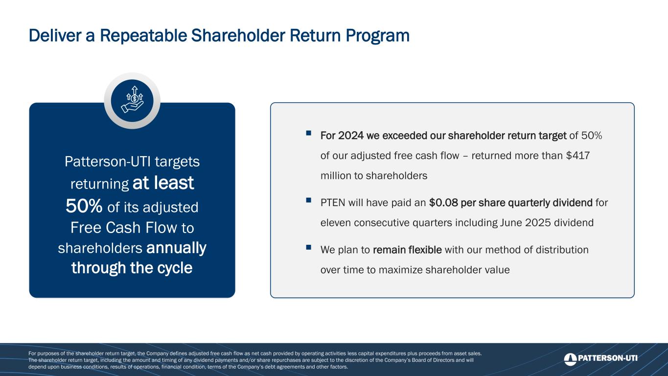 Deliver a Repeatable Shareholder Return Program For purposes of the shareholder return target, the Company defines adjusted free cash flow as net cash provided by operating activities less capital expenditures plus proceeds from asset sales. The shareholder return target, including the amount and timing of any dividend payments and/or share repurchases are subject to the discretion of the Company’s Board of Directors and will depend upon business conditions, results of operations, financial condition, terms of the Company’s debt agreements and other factors. Patterson-UTI targets returning at least 50% of its adjusted Free Cash Flow to shareholders annually through the cycle ▪ For 2024 we exceeded our shareholder return target of 50% of our adjusted free cash flow – returned more than $417 million to shareholders ▪ PTEN will have paid an $0.08 per share quarterly dividend for eleven consecutive quarters including June 2025 dividend ▪ We plan to remain flexible with our method of distribution over time to maximize shareholder value
