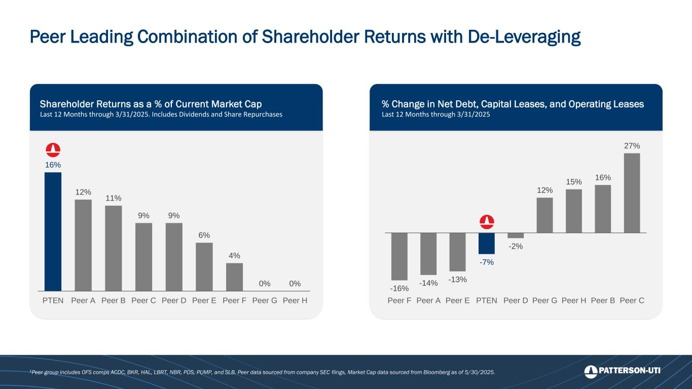 Shareholder Returns as a % of Current Market Cap Last 12 Months through 3/31/2025. Includes Dividends and Share Repurchases Shareholder Returns as a % of Current Market Cap Includes Dividends and Share Repurchases 1Peer group includes OFS comps ACDC, BKR, HAL, LBRT, NBR, PDS, PUMP, and SLB. Peer data sourced from company SEC fiings, Market Cap data sourced from Bloomberg as of 5/30/2025. Peer Leading Combination of Shareholder Returns with De-Leveraging 16% 12% 11% 9% 9% 6% 4% 0% 0% PTEN Peer A Peer B Peer C Peer D Peer E Peer F Peer G Peer H % Change i Net Debt, C pital Leases, and Operating Leases Last 12 Months through 3/31/2025 -16% -14% -13% -7% -2% 12% 15% 16% 27% Peer F Peer A Peer E PTEN Peer D Peer G Peer H Peer B Peer C