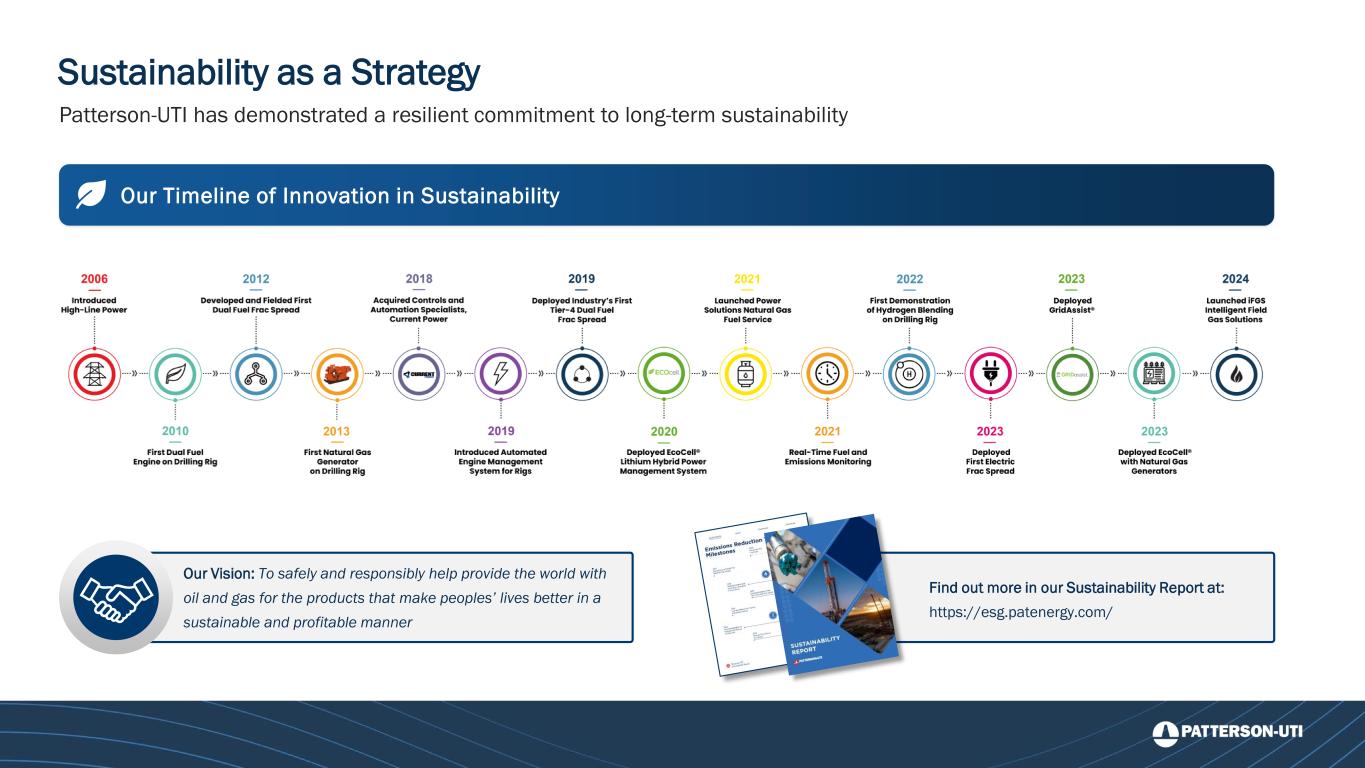Sustainability as a Strategy Our Vision: To safely and responsibly help provide the world with oil and gas for the products that make peoples’ lives better in a sustainable and profitable manner Find out more in our Sustainability Report at: https://esg.patenergy.com/ Patterson-UTI has demonstrated a resilient commitment to long-term sustainability Our Timeline of Innovation in Sustainability