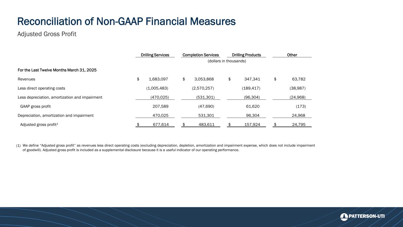 Reconciliation of Non-GAAP Financial Measures Adjusted Gross Profit Drilling Services Completion Services Drilling Products Other (dollars in thousands) For the Last Twelve Months March 31, 2025 Revenues $ 1,683,097 $ 3,053,868 $ 347,341 $ 63,782 Less direct operating costs (1,005,483) (2,570,257) (189,417) (38,987) Less depreciation, amortization and impairment (470,025) (531,301) (96,304) (24,968) GAAP gross profit 207,589 (47,690) 61,620 (173) Depreciation, amortization and impairment 470,025 531,301 96,304 24,968 Adjusted gross profit1 $ 677,614 $ 483,611 $ 157,924 $ 24,795 (1) We define “Adjusted gross profit” as revenues less direct operating costs (excluding depreciation, depletion, amortization and impairment expense, which does not include impairment of goodwill). Adjusted gross profit is included as a supplemental disclosure because it is a useful indicator of our operating performance.