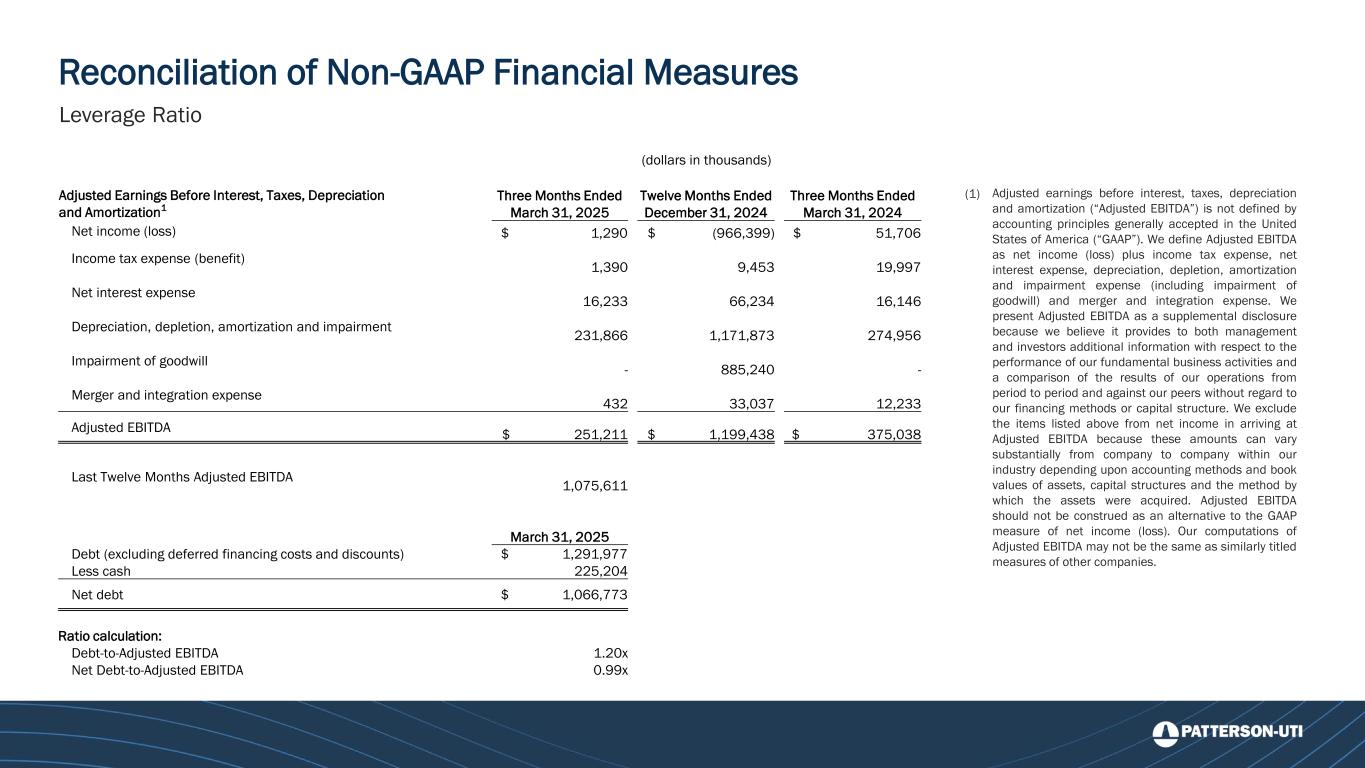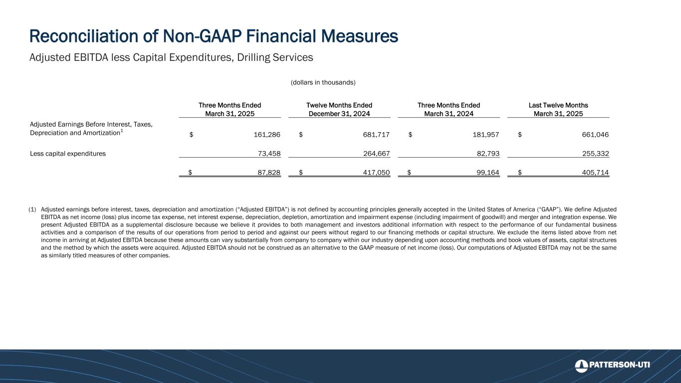 Reconciliation of Non-GAAP Financial Measures Adjusted EBITDA less Capital Expenditures, Drilling Services (1) Adjusted earnings before interest, taxes, depreciation and amortization (“Adjusted EBITDA”) is not defined by accounting principles generally accepted in the United States of America (“GAAP”). We define Adjusted EBITDA as net income (loss) plus income tax expense, net interest expense, depreciation, depletion, amortization and impairment expense (including impairment of goodwill) and merger and integration expense. We present Adjusted EBITDA as a supplemental disclosure because we believe it provides to both management and investors additional information with respect to the performance of our fundamental business activities and a comparison of the results of our operations from period to period and against our peers without regard to our financing methods or capital structure. We exclude the items listed above from net income in arriving at Adjusted EBITDA because these amounts can vary substantially from company to company within our industry depending upon accounting methods and book values of assets, capital structures and the method by which the assets were acquired. Adjusted EBITDA should not be construed as an alternative to the GAAP measure of net income (loss). Our computations of Adjusted EBITDA may not be the same as similarly titled measures of other companies. (dollars in thousands) Three Months Ended March 31, 2025 Twelve Months Ended December 31, 2024 Three Months Ended March 31, 2024 Last Twelve Months March 31, 2025 Adjusted Earnings Before Interest, Taxes, Depreciation and Amortization1 $ 161,286 $ 681,717 $ 181,957 $ 661,046 Less capital expenditures 73,458 264,667 82,793 255,332 $ 87,828 $ 417,050 $ 99,164 $ 405,714