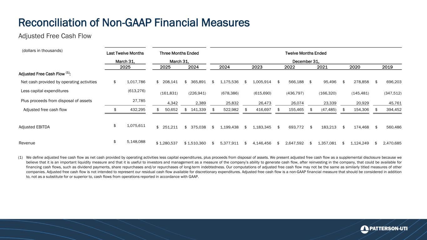 Reconciliation of Non-GAAP Financial Measures Adjusted Free Cash Flow (1) We define adjusted free cash flow as net cash provided by operating activities less capital expenditures, plus proceeds from disposal of assets. We present adjusted free cash flow as a supplemental disclosure because we believe that it is an important liquidity measure and that it is useful to investors and management as a measure of the company’s ability to generate cash flow, after reinvesting in the company, that could be available for financing cash flows, such as dividend payments, share repurchases and/or repurchases of long-term indebtedness. Our computations of adjusted free cash flow may not be the same as similarly titled measures of other companies. Adjusted free cash flow is not intended to represent our residual cash flow available for discretionary expenditures. Adjusted free cash flow is a non-GAAP financial measure that should be considered in addition to, not as a substitute for or superior to, cash flows from operations reported in accordance with GAAP. (dollars in thousands) Last Twelve Months Three Months Ended Twelve Months Ended March 31, March 31, December 31, 2025 2025 2024 2024 2023 2022 2021 2020 2019 Adjusted Free Cash Flow (1): Net cash provided by operating activities $ 1,017,786 $ 208,141 $ 365,891 $ 1,175,536 $ 1,005,914 $ 566,188 $ 95,496 $ 278,858 $ 696,203 Less capital expenditures (613,276) (161,831) (226,941) (678,386) (615,690) (436,797) (166,320) (145,481) (347,512) Plus proceeds from disposal of assets 27,785 4,342 2,389 25,832 26,473 26,074 23,339 20,929 45,761 Adjusted free cash flow $ 432,295 $ 50,652 $ 141,339 $ 522,982 $ 416,697 $ 155,465 $ (47,485) $ 154,306 $ 394,452 Adjusted EBITDA $ 1,075,611 $ 251,211 $ 375,038 $ 1,199,438 $ 1,183,345 $ 693,772 $ 183,213 $ 174,468 $ 560,486 Revenue $ 5,148,088 $ 1,280,537 $ 1,510,360 $ 5,377,911 $ 4,146,456 $ 2,647,592 $ 1,357,081 $ 1,124,249 $ 2,470,685
