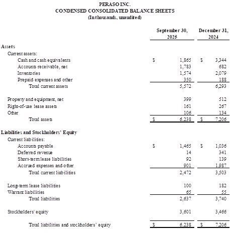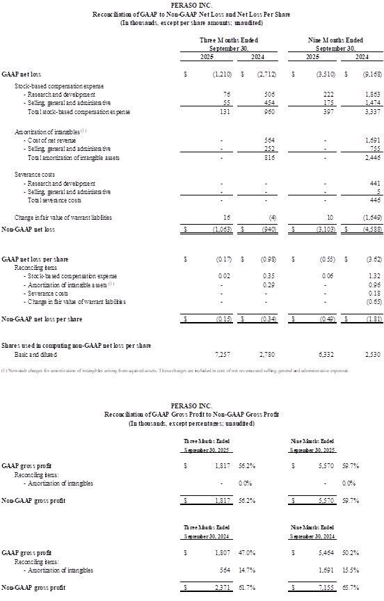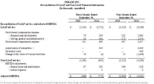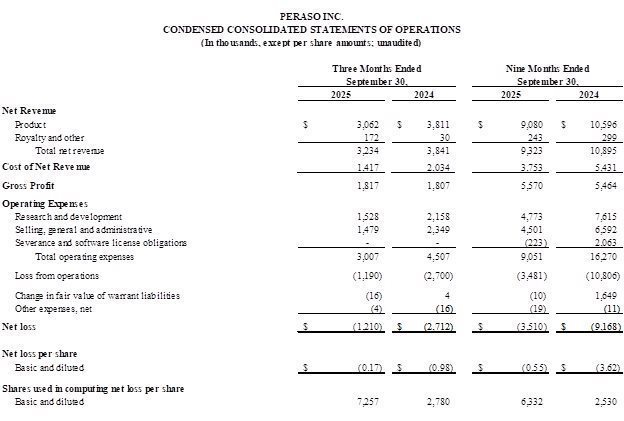 SAN JOSE, Calif., November 10, 2025 – Peraso Inc. (NASDAQ: PRSO) (“Peraso” or the “Company”), a pioneer in mmWave wireless technology solutions, today announced financial results for the third quarter ended September 30, 2025.