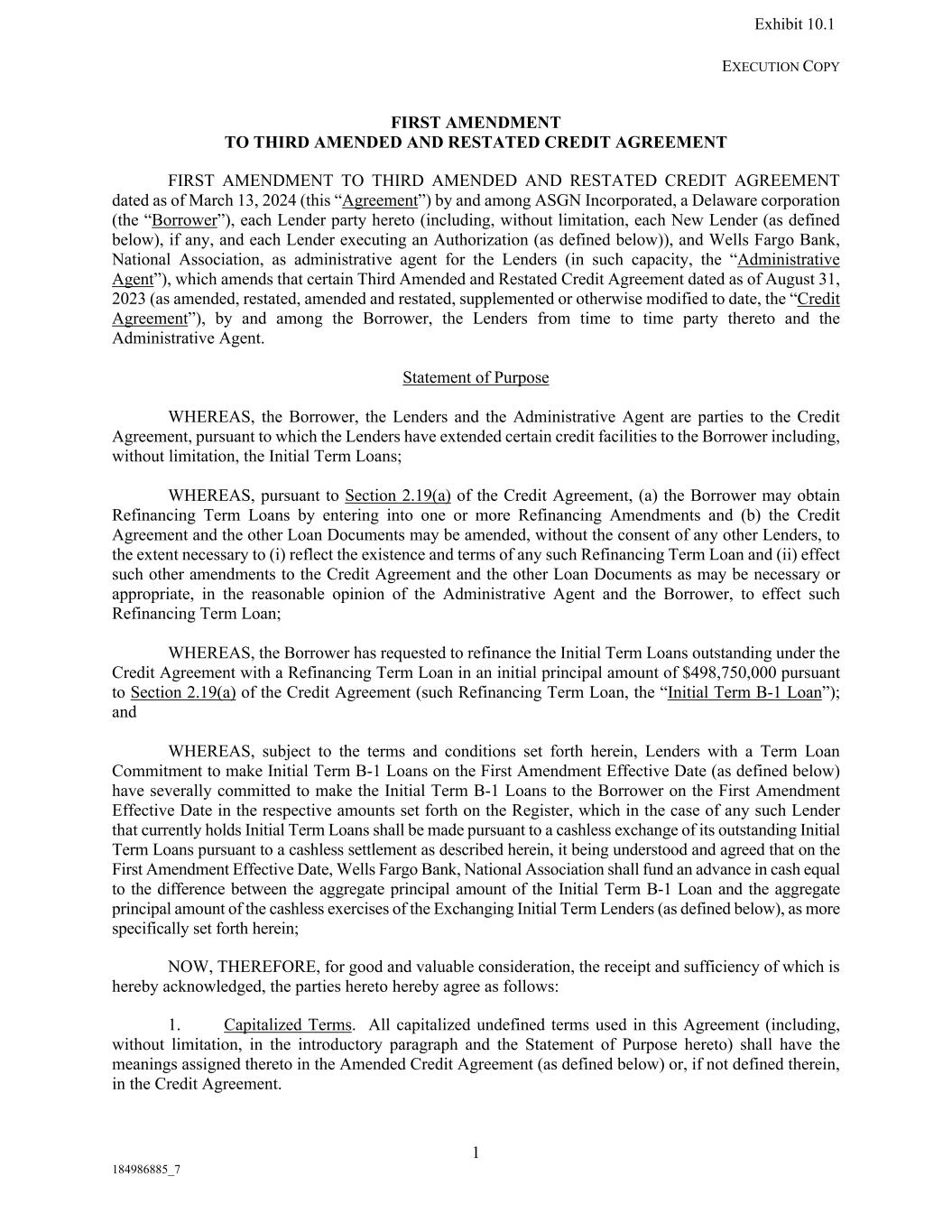 EXECUTION COPY 1 184986885_7 FIRST AMENDMENT TO THIRD AMENDED AND RESTATED CREDIT AGREEMENT FIRST AMENDMENT TO THIRD AMENDED AND RESTATED CREDIT AGREEMENT dated as of March 13, 2024 (this “Agreement”) by and among ASGN Incorporated, a Delaware corporation (the “Borrower”), each Lender party hereto (including, without limitation, each New Lender (as defined below), if any, and each Lender executing an Authorization (as defined below)), and Wells Fargo Bank, National Association, as administrative agent for the Lenders (in such capacity, the “Administrative Agent”), which amends that certain Third Amended and Restated Credit Agreement dated as of August 31, 2023 (as amended, restated, amended and restated, supplemented or otherwise modified to date, the “Credit Agreement”), by and among the Borrower, the Lenders from time to time party thereto and the Administrative Agent. Statement of Purpose WHEREAS, the Borrower, the Lenders and the Administrative Agent are parties to the Credit Agreement, pursuant to which the Lenders have extended certain credit facilities to the Borrower including, without limitation, the Initial Term Loans; WHEREAS, pursuant to Section 2.19(a) of the Credit Agreement, (a) the Borrower may obtain Refinancing Term Loans by entering into one or more Refinancing Amendments and (b) the Credit Agreement and the other Loan Documents may be amended, without the consent of any other Lenders, to the extent necessary to (i) reflect the existence and terms of any such Refinancing Term Loan and (ii) effect such other amendments to the Credit Agreement and the other Loan Documents as may be necessary or appropriate, in the reasonable opinion of the Administrative Agent and the Borrower, to effect such Refinancing Term Loan; WHEREAS, the Borrower has requested to refinance the Initial Term Loans outstanding under the Credit Agreement with a Refinancing Term Loan in an initial principal amount of $498,750,000 pursuant to Section 2.19(a) of the Credit Agreement (such Refinancing Term Loan, the “Initial Term B-1 Loan”); and WHEREAS, subject to the terms and conditions set forth herein, Lenders with a Term Loan Commitment to make Initial Term B-1 Loans on the First Amendment Effective Date (as defined below) have severally committed to make the Initial Term B-1 Loans to the Borrower on the First Amendment Effective Date in the respective amounts set forth on the Register, which in the case of any such Lender that currently holds Initial Term Loans shall be made pursuant to a cashless exchange of its outstanding Initial Term Loans pursuant to a cashless settlement as described herein, it being understood and agreed that on the First Amendment Effective Date, Wells Fargo Bank, National Association shall fund an advance in cash equal to the difference between the aggregate principal amount of the Initial Term B-1 Loan and the aggregate principal amount of the cashless exercises of the Exchanging Initial Term Lenders (as defined below), as more specifically set forth herein; NOW, THEREFORE, for good and valuable consideration, the receipt and sufficiency of which is hereby acknowledged, the parties hereto hereby agree as follows: 1. Capitalized Terms. All capitalized undefined terms used in this Agreement (including, without limitation, in the introductory paragraph and the Statement of Purpose hereto) shall have the meanings assigned thereto in the Amended Credit Agreement (as defined below) or, if not defined therein, in the Credit Agreement. Exhibit 10.1