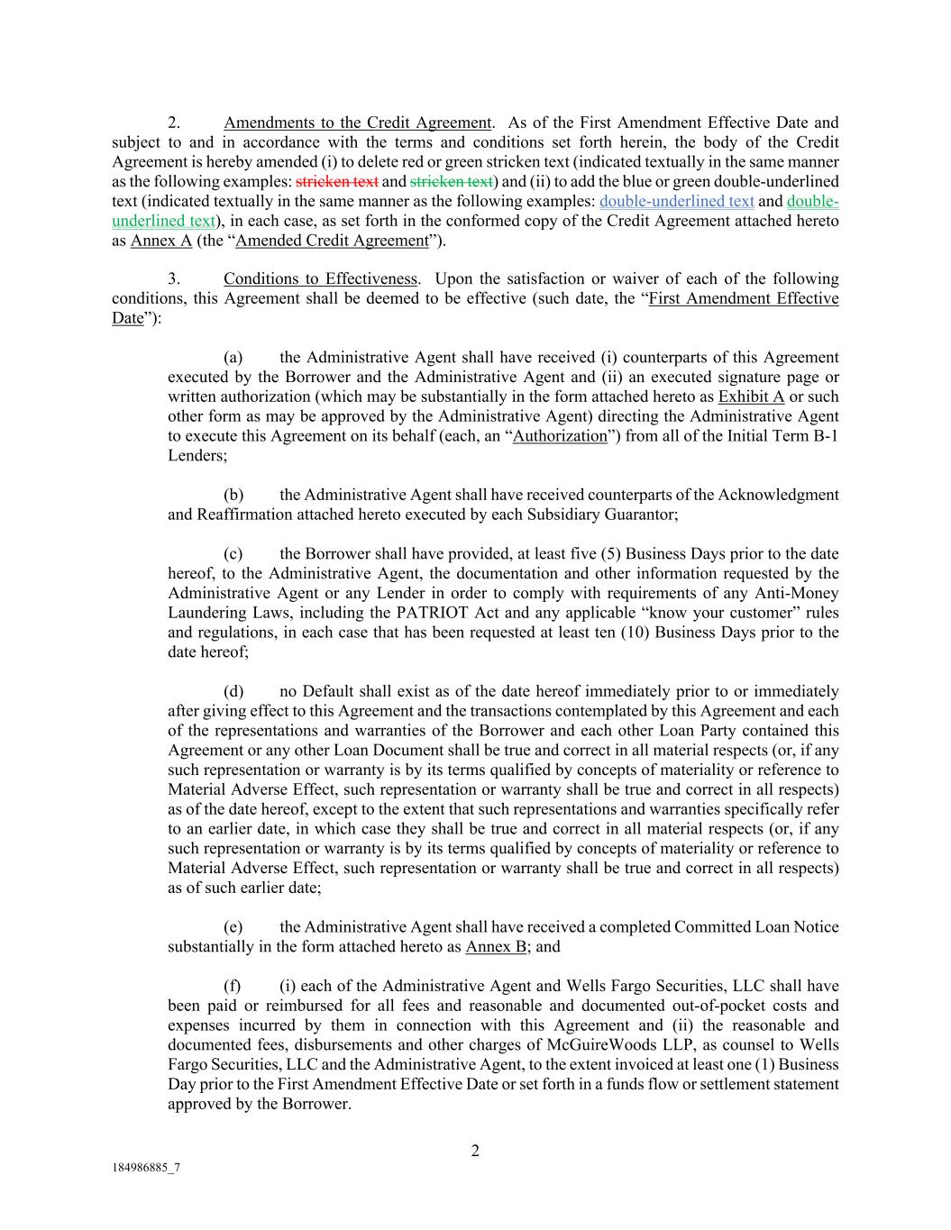 2 184986885_7 2. Amendments to the Credit Agreement. As of the First Amendment Effective Date and subject to and in accordance with the terms and conditions set forth herein, the body of the Credit Agreement is hereby amended (i) to delete red or green stricken text (indicated textually in the same manner as the following examples: stricken text and stricken text) and (ii) to add the blue or green double-underlined text (indicated textually in the same manner as the following examples: double-underlined text and double- underlined text), in each case, as set forth in the conformed copy of the Credit Agreement attached hereto as Annex A (the “Amended Credit Agreement”). 3. Conditions to Effectiveness. Upon the satisfaction or waiver of each of the following conditions, this Agreement shall be deemed to be effective (such date, the “First Amendment Effective Date”): (a) the Administrative Agent shall have received (i) counterparts of this Agreement executed by the Borrower and the Administrative Agent and (ii) an executed signature page or written authorization (which may be substantially in the form attached hereto as Exhibit A or such other form as may be approved by the Administrative Agent) directing the Administrative Agent to execute this Agreement on its behalf (each, an “Authorization”) from all of the Initial Term B-1 Lenders; (b) the Administrative Agent shall have received counterparts of the Acknowledgment and Reaffirmation attached hereto executed by each Subsidiary Guarantor; (c) the Borrower shall have provided, at least five (5) Business Days prior to the date hereof, to the Administrative Agent, the documentation and other information requested by the Administrative Agent or any Lender in order to comply with requirements of any Anti-Money Laundering Laws, including the PATRIOT Act and any applicable “know your customer” rules and regulations, in each case that has been requested at least ten (10) Business Days prior to the date hereof; (d) no Default shall exist as of the date hereof immediately prior to or immediately after giving effect to this Agreement and the transactions contemplated by this Agreement and each of the representations and warranties of the Borrower and each other Loan Party contained this Agreement or any other Loan Document shall be true and correct in all material respects (or, if any such representation or warranty is by its terms qualified by concepts of materiality or reference to Material Adverse Effect, such representation or warranty shall be true and correct in all respects) as of the date hereof, except to the extent that such representations and warranties specifically refer to an earlier date, in which case they shall be true and correct in all material respects (or, if any such representation or warranty is by its terms qualified by concepts of materiality or reference to Material Adverse Effect, such representation or warranty shall be true and correct in all respects) as of such earlier date; (e) the Administrative Agent shall have received a completed Committed Loan Notice substantially in the form attached hereto as Annex B; and (f) (i) each of the Administrative Agent and Wells Fargo Securities, LLC shall have been paid or reimbursed for all fees and reasonable and documented out-of-pocket costs and expenses incurred by them in connection with this Agreement and (ii) the reasonable and documented fees, disbursements and other charges of McGuireWoods LLP, as counsel to Wells Fargo Securities, LLC and the Administrative Agent, to the extent invoiced at least one (1) Business Day prior to the First Amendment Effective Date or set forth in a funds flow or settlement statement approved by the Borrower.