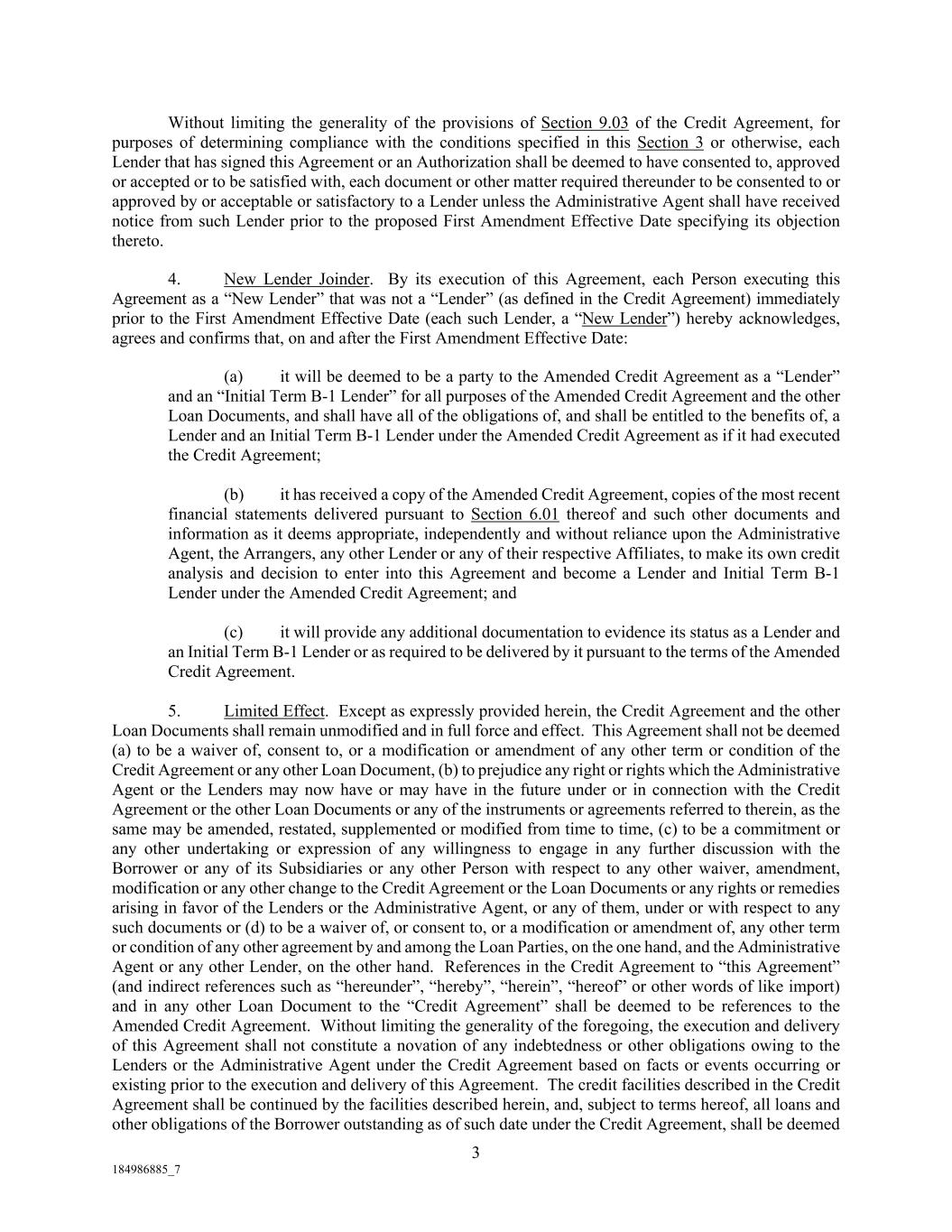 3 184986885_7 Without limiting the generality of the provisions of Section 9.03 of the Credit Agreement, for purposes of determining compliance with the conditions specified in this Section 3 or otherwise, each Lender that has signed this Agreement or an Authorization shall be deemed to have consented to, approved or accepted or to be satisfied with, each document or other matter required thereunder to be consented to or approved by or acceptable or satisfactory to a Lender unless the Administrative Agent shall have received notice from such Lender prior to the proposed First Amendment Effective Date specifying its objection thereto. 4. New Lender Joinder. By its execution of this Agreement, each Person executing this Agreement as a “New Lender” that was not a “Lender” (as defined in the Credit Agreement) immediately prior to the First Amendment Effective Date (each such Lender, a “New Lender”) hereby acknowledges, agrees and confirms that, on and after the First Amendment Effective Date: (a) it will be deemed to be a party to the Amended Credit Agreement as a “Lender” and an “Initial Term B-1 Lender” for all purposes of the Amended Credit Agreement and the other Loan Documents, and shall have all of the obligations of, and shall be entitled to the benefits of, a Lender and an Initial Term B-1 Lender under the Amended Credit Agreement as if it had executed the Credit Agreement; (b) it has received a copy of the Amended Credit Agreement, copies of the most recent financial statements delivered pursuant to Section 6.01 thereof and such other documents and information as it deems appropriate, independently and without reliance upon the Administrative Agent, the Arrangers, any other Lender or any of their respective Affiliates, to make its own credit analysis and decision to enter into this Agreement and become a Lender and Initial Term B-1 Lender under the Amended Credit Agreement; and (c) it will provide any additional documentation to evidence its status as a Lender and an Initial Term B-1 Lender or as required to be delivered by it pursuant to the terms of the Amended Credit Agreement. 5. Limited Effect. Except as expressly provided herein, the Credit Agreement and the other Loan Documents shall remain unmodified and in full force and effect. This Agreement shall not be deemed (a) to be a waiver of, consent to, or a modification or amendment of any other term or condition of the Credit Agreement or any other Loan Document, (b) to prejudice any right or rights which the Administrative Agent or the Lenders may now have or may have in the future under or in connection with the Credit Agreement or the other Loan Documents or any of the instruments or agreements referred to therein, as the same may be amended, restated, supplemented or modified from time to time, (c) to be a commitment or any other undertaking or expression of any willingness to engage in any further discussion with the Borrower or any of its Subsidiaries or any other Person with respect to any other waiver, amendment, modification or any other change to the Credit Agreement or the Loan Documents or any rights or remedies arising in favor of the Lenders or the Administrative Agent, or any of them, under or with respect to any such documents or (d) to be a waiver of, or consent to, or a modification or amendment of, any other term or condition of any other agreement by and among the Loan Parties, on the one hand, and the Administrative Agent or any other Lender, on the other hand. References in the Credit Agreement to “this Agreement” (and indirect references such as “hereunder”, “hereby”, “herein”, “hereof” or other words of like import) and in any other Loan Document to the “Credit Agreement” shall be deemed to be references to the Amended Credit Agreement. Without limiting the generality of the foregoing, the execution and delivery of this Agreement shall not constitute a novation of any indebtedness or other obligations owing to the Lenders or the Administrative Agent under the Credit Agreement based on facts or events occurring or existing prior to the execution and delivery of this Agreement. The credit facilities described in the Credit Agreement shall be continued by the facilities described herein, and, subject to terms hereof, all loans and other obligations of the Borrower outstanding as of such date under the Credit Agreement, shall be deemed
