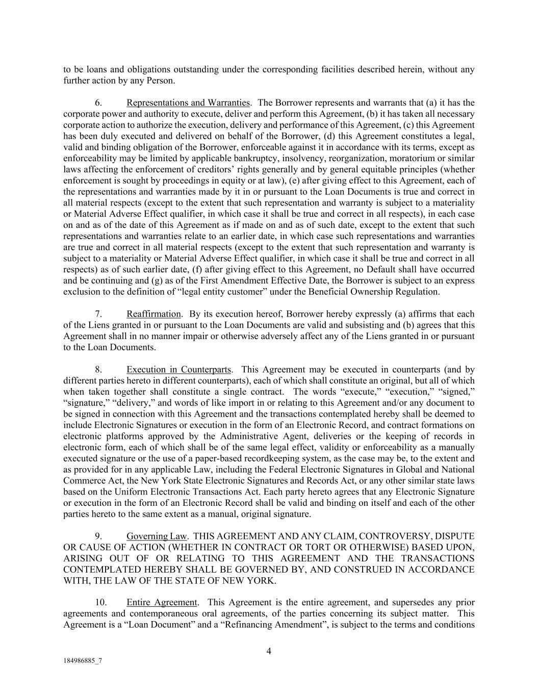 4 184986885_7 to be loans and obligations outstanding under the corresponding facilities described herein, without any further action by any Person. 6. Representations and Warranties. The Borrower represents and warrants that (a) it has the corporate power and authority to execute, deliver and perform this Agreement, (b) it has taken all necessary corporate action to authorize the execution, delivery and performance of this Agreement, (c) this Agreement has been duly executed and delivered on behalf of the Borrower, (d) this Agreement constitutes a legal, valid and binding obligation of the Borrower, enforceable against it in accordance with its terms, except as enforceability may be limited by applicable bankruptcy, insolvency, reorganization, moratorium or similar laws affecting the enforcement of creditors’ rights generally and by general equitable principles (whether enforcement is sought by proceedings in equity or at law), (e) after giving effect to this Agreement, each of the representations and warranties made by it in or pursuant to the Loan Documents is true and correct in all material respects (except to the extent that such representation and warranty is subject to a materiality or Material Adverse Effect qualifier, in which case it shall be true and correct in all respects), in each case on and as of the date of this Agreement as if made on and as of such date, except to the extent that such representations and warranties relate to an earlier date, in which case such representations and warranties are true and correct in all material respects (except to the extent that such representation and warranty is subject to a materiality or Material Adverse Effect qualifier, in which case it shall be true and correct in all respects) as of such earlier date, (f) after giving effect to this Agreement, no Default shall have occurred and be continuing and (g) as of the First Amendment Effective Date, the Borrower is subject to an express exclusion to the definition of “legal entity customer” under the Beneficial Ownership Regulation. 7. Reaffirmation. By its execution hereof, Borrower hereby expressly (a) affirms that each of the Liens granted in or pursuant to the Loan Documents are valid and subsisting and (b) agrees that this Agreement shall in no manner impair or otherwise adversely affect any of the Liens granted in or pursuant to the Loan Documents. 8. Execution in Counterparts. This Agreement may be executed in counterparts (and by different parties hereto in different counterparts), each of which shall constitute an original, but all of which when taken together shall constitute a single contract. The words “execute,” “execution,” “signed,” “signature,” “delivery,” and words of like import in or relating to this Agreement and/or any document to be signed in connection with this Agreement and the transactions contemplated hereby shall be deemed to include Electronic Signatures or execution in the form of an Electronic Record, and contract formations on electronic platforms approved by the Administrative Agent, deliveries or the keeping of records in electronic form, each of which shall be of the same legal effect, validity or enforceability as a manually executed signature or the use of a paper-based recordkeeping system, as the case may be, to the extent and as provided for in any applicable Law, including the Federal Electronic Signatures in Global and National Commerce Act, the New York State Electronic Signatures and Records Act, or any other similar state laws based on the Uniform Electronic Transactions Act. Each party hereto agrees that any Electronic Signature or execution in the form of an Electronic Record shall be valid and binding on itself and each of the other parties hereto to the same extent as a manual, original signature. 9. Governing Law. THIS AGREEMENT AND ANY CLAIM, CONTROVERSY, DISPUTE OR CAUSE OF ACTION (WHETHER IN CONTRACT OR TORT OR OTHERWISE) BASED UPON, ARISING OUT OF OR RELATING TO THIS AGREEMENT AND THE TRANSACTIONS CONTEMPLATED HEREBY SHALL BE GOVERNED BY, AND CONSTRUED IN ACCORDANCE WITH, THE LAW OF THE STATE OF NEW YORK. 10. Entire Agreement. This Agreement is the entire agreement, and supersedes any prior agreements and contemporaneous oral agreements, of the parties concerning its subject matter. This Agreement is a “Loan Document” and a “Refinancing Amendment”, is subject to the terms and conditions