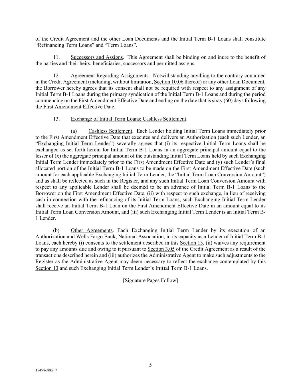 5 184986885_7 of the Credit Agreement and the other Loan Documents and the Initial Term B-1 Loans shall constitute “Refinancing Term Loans” and “Term Loans”. 11. Successors and Assigns. This Agreement shall be binding on and inure to the benefit of the parties and their heirs, beneficiaries, successors and permitted assigns. 12. Agreement Regarding Assignments. Notwithstanding anything to the contrary contained in the Credit Agreement (including, without limitation, Section 10.06 thereof) or any other Loan Document, the Borrower hereby agrees that its consent shall not be required with respect to any assignment of any Initial Term B-1 Loans during the primary syndication of the Initial Term B-1 Loans and during the period commencing on the First Amendment Effective Date and ending on the date that is sixty (60) days following the First Amendment Effective Date. 13. Exchange of Initial Term Loans; Cashless Settlement. (a) Cashless Settlement. Each Lender holding Initial Term Loans immediately prior to the First Amendment Effective Date that executes and delivers an Authorization (each such Lender, an “Exchanging Initial Term Lender”) severally agrees that (i) its respective Initial Term Loans shall be exchanged as set forth herein for Initial Term B-1 Loans in an aggregate principal amount equal to the lesser of (x) the aggregate principal amount of the outstanding Initial Term Loans held by such Exchanging Initial Term Lender immediately prior to the First Amendment Effective Date and (y) such Lender’s final allocated portion of the Initial Term B-1 Loans to be made on the First Amendment Effective Date (such amount for each applicable Exchanging Initial Term Lender, the “Initial Term Loan Conversion Amount”) and as shall be reflected as such in the Register, and any such Initial Term Loan Conversion Amount with respect to any applicable Lender shall be deemed to be an advance of Initial Term B-1 Loans to the Borrower on the First Amendment Effective Date, (ii) with respect to such exchange, in lieu of receiving cash in connection with the refinancing of its Initial Term Loans, such Exchanging Initial Term Lender shall receive an Initial Term B-1 Loan on the First Amendment Effective Date in an amount equal to its Initial Term Loan Conversion Amount, and (iii) such Exchanging Initial Term Lender is an Initial Term B- 1 Lender. (b) Other Agreements. Each Exchanging Initial Term Lender by its execution of an Authorization and Wells Fargo Bank, National Association, in its capacity as a Lender of Initial Term B-1 Loans, each hereby (i) consents to the settlement described in this Section 13, (ii) waives any requirement to pay any amounts due and owing to it pursuant to Section 3.05 of the Credit Agreement as a result of the transactions described herein and (iii) authorizes the Administrative Agent to make such adjustments to the Register as the Administrative Agent may deem necessary to reflect the exchange contemplated by this Section 13 and such Exchanging Initial Term Lender’s Initial Term B-1 Loans. [Signature Pages Follow]