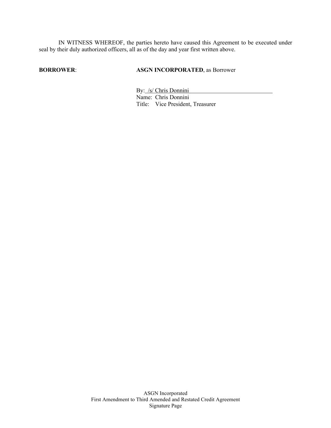 ASGN Incorporated First Amendment to Third Amended and Restated Credit Agreement Signature Page IN WITNESS WHEREOF, the parties hereto have caused this Agreement to be executed under seal by their duly authorized officers, all as of the day and year first written above. BORROWER: ASGN INCORPORATED, as Borrower By: /s/ Chris Donnini Name: Chris Donnini Title: Vice President, Treasurer