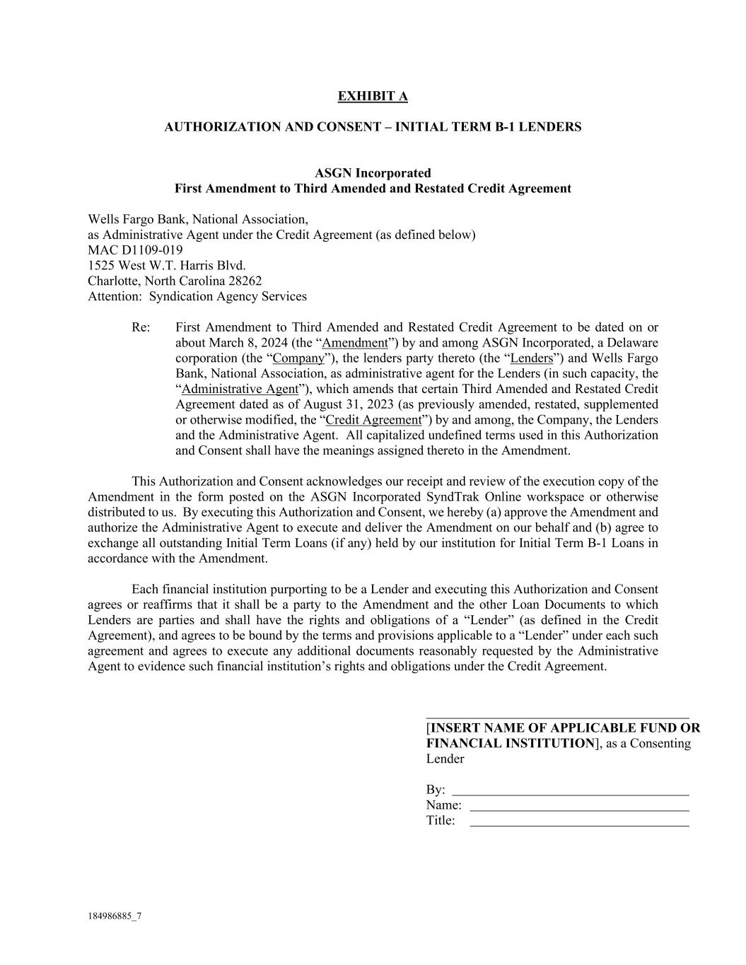 184986885_7 EXHIBIT A AUTHORIZATION AND CONSENT – INITIAL TERM B-1 LENDERS ASGN Incorporated First Amendment to Third Amended and Restated Credit Agreement Wells Fargo Bank, National Association, as Administrative Agent under the Credit Agreement (as defined below) MAC D1109-019 1525 West W.T. Harris Blvd. Charlotte, North Carolina 28262 Attention: Syndication Agency Services Re: First Amendment to Third Amended and Restated Credit Agreement to be dated on or about March 8, 2024 (the “Amendment”) by and among ASGN Incorporated, a Delaware corporation (the “Company”), the lenders party thereto (the “Lenders”) and Wells Fargo Bank, National Association, as administrative agent for the Lenders (in such capacity, the “Administrative Agent”), which amends that certain Third Amended and Restated Credit Agreement dated as of August 31, 2023 (as previously amended, restated, supplemented or otherwise modified, the “Credit Agreement”) by and among, the Company, the Lenders and the Administrative Agent. All capitalized undefined terms used in this Authorization and Consent shall have the meanings assigned thereto in the Amendment. This Authorization and Consent acknowledges our receipt and review of the execution copy of the Amendment in the form posted on the ASGN Incorporated SyndTrak Online workspace or otherwise distributed to us. By executing this Authorization and Consent, we hereby (a) approve the Amendment and authorize the Administrative Agent to execute and deliver the Amendment on our behalf and (b) agree to exchange all outstanding Initial Term Loans (if any) held by our institution for Initial Term B-1 Loans in accordance with the Amendment. Each financial institution purporting to be a Lender and executing this Authorization and Consent agrees or reaffirms that it shall be a party to the Amendment and the other Loan Documents to which Lenders are parties and shall have the rights and obligations of a “Lender” (as defined in the Credit Agreement), and agrees to be bound by the terms and provisions applicable to a “Lender” under each such agreement and agrees to execute any additional documents reasonably requested by the Administrative Agent to evidence such financial institution’s rights and obligations under the Credit Agreement. [INSERT NAME OF APPLICABLE FUND OR FINANCIAL INSTITUTION], as a Consenting Lender By: Name: Title: