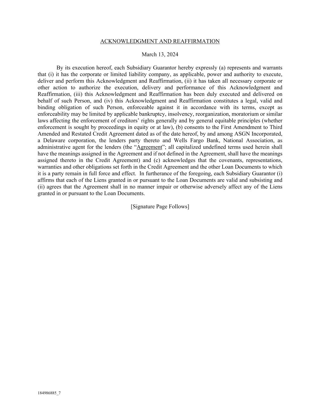 184986885_7 ACKNOWLEDGMENT AND REAFFIRMATION March 13, 2024 By its execution hereof, each Subsidiary Guarantor hereby expressly (a) represents and warrants that (i) it has the corporate or limited liability company, as applicable, power and authority to execute, deliver and perform this Acknowledgment and Reaffirmation, (ii) it has taken all necessary corporate or other action to authorize the execution, delivery and performance of this Acknowledgment and Reaffirmation, (iii) this Acknowledgment and Reaffirmation has been duly executed and delivered on behalf of such Person, and (iv) this Acknowledgment and Reaffirmation constitutes a legal, valid and binding obligation of such Person, enforceable against it in accordance with its terms, except as enforceability may be limited by applicable bankruptcy, insolvency, reorganization, moratorium or similar laws affecting the enforcement of creditors’ rights generally and by general equitable principles (whether enforcement is sought by proceedings in equity or at law), (b) consents to the First Amendment to Third Amended and Restated Credit Agreement dated as of the date hereof, by and among ASGN Incorporated, a Delaware corporation, the lenders party thereto and Wells Fargo Bank, National Association, as administrative agent for the lenders (the “Agreement”; all capitalized undefined terms used herein shall have the meanings assigned in the Agreement and if not defined in the Agreement, shall have the meanings assigned thereto in the Credit Agreement) and (c) acknowledges that the covenants, representations, warranties and other obligations set forth in the Credit Agreement and the other Loan Documents to which it is a party remain in full force and effect. In furtherance of the foregoing, each Subsidiary Guarantor (i) affirms that each of the Liens granted in or pursuant to the Loan Documents are valid and subsisting and (ii) agrees that the Agreement shall in no manner impair or otherwise adversely affect any of the Liens granted in or pursuant to the Loan Documents. [Signature Page Follows]