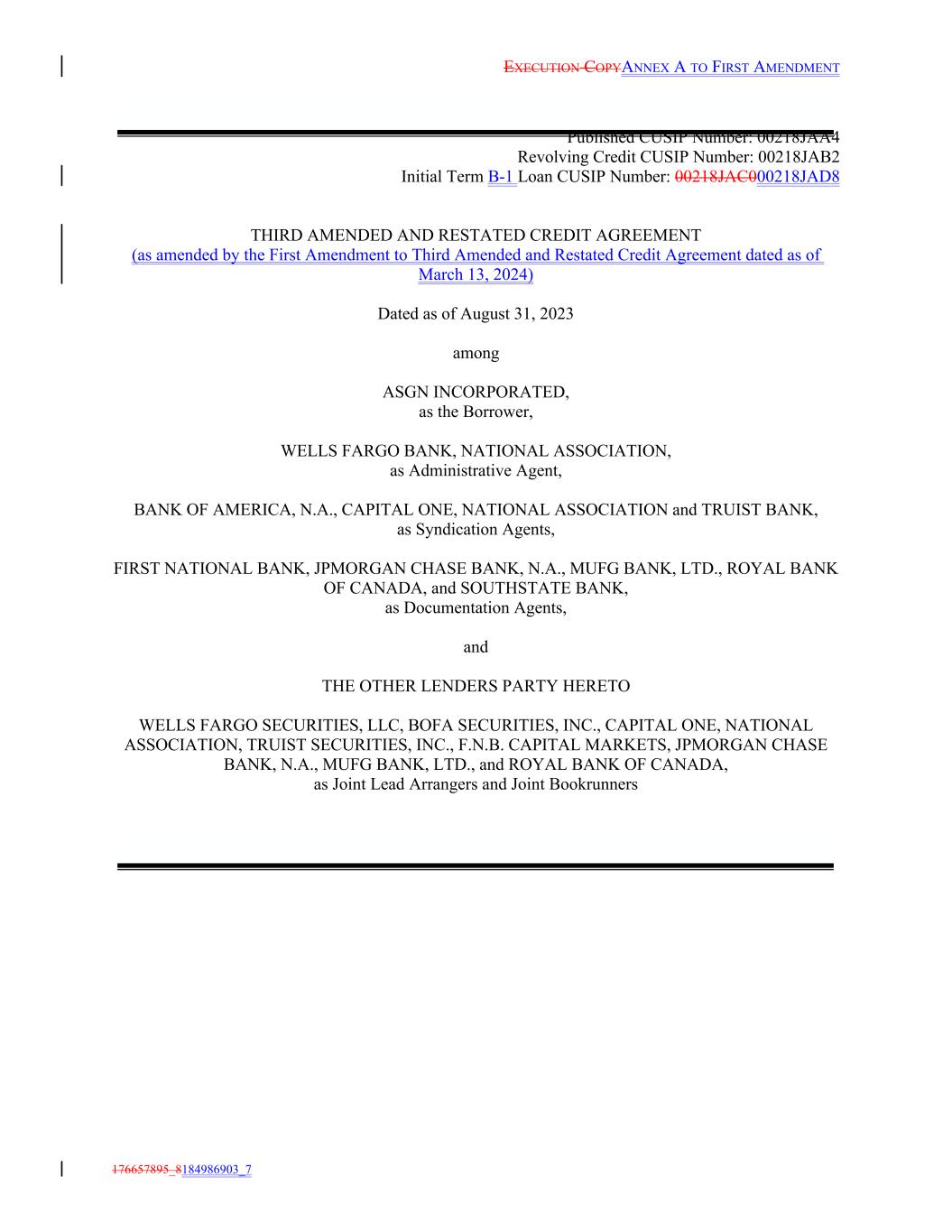EXECUTION COPYANNEX A TO FIRST AMENDMENT 176657895_8184986903_7 Published CUSIP Number: 00218JAA4 Revolving Credit CUSIP Number: 00218JAB2 Initial Term B-1 Loan CUSIP Number: 00218JAC000218JAD8 THIRD AMENDED AND RESTATED CREDIT AGREEMENT (as amended by the First Amendment to Third Amended and Restated Credit Agreement dated as of March 13, 2024) Dated as of August 31, 2023 among ASGN INCORPORATED, as the Borrower, WELLS FARGO BANK, NATIONAL ASSOCIATION, as Administrative Agent, BANK OF AMERICA, N.A., CAPITAL ONE, NATIONAL ASSOCIATION and TRUIST BANK, as Syndication Agents, FIRST NATIONAL BANK, JPMORGAN CHASE BANK, N.A., MUFG BANK, LTD., ROYAL BANK OF CANADA, and SOUTHSTATE BANK, as Documentation Agents, and THE OTHER LENDERS PARTY HERETO WELLS FARGO SECURITIES, LLC, BOFA SECURITIES, INC., CAPITAL ONE, NATIONAL ASSOCIATION, TRUIST SECURITIES, INC., F.N.B. CAPITAL MARKETS, JPMORGAN CHASE BANK, N.A., MUFG BANK, LTD., and ROYAL BANK OF CANADA, as Joint Lead Arrangers and Joint Bookrunners