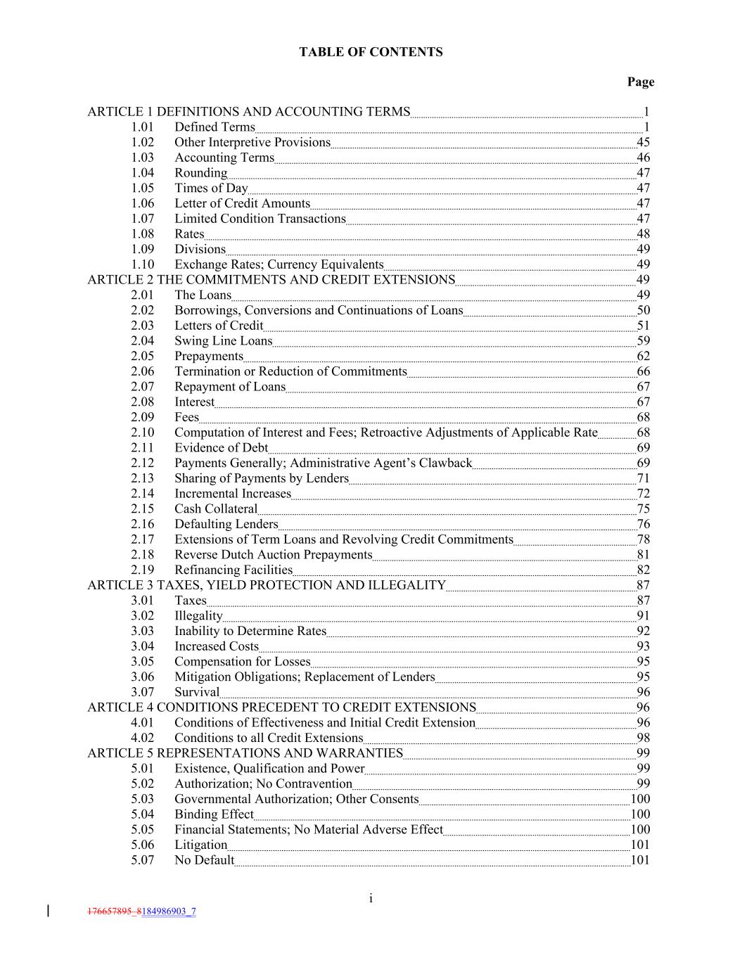 TABLE OF CONTENTS Page ARTICLE 1 DEFINITIONS AND ACCOUNTING TERMS 1 1.01 Defined Terms 1 1.02 Other Interpretive Provisions 45 1.03 Accounting Terms 46 1.04 Rounding 47 1.05 Times of Day 47 1.06 Letter of Credit Amounts 47 1.07 Limited Condition Transactions 47 1.08 Rates 48 1.09 Divisions 49 1.10 Exchange Rates; Currency Equivalents 49 ARTICLE 2 THE COMMITMENTS AND CREDIT EXTENSIONS 49 2.01 The Loans 49 2.02 Borrowings, Conversions and Continuations of Loans 50 2.03 Letters of Credit 51 2.04 Swing Line Loans 59 2.05 Prepayments 62 2.06 Termination or Reduction of Commitments 66 2.07 Repayment of Loans 67 2.08 Interest 67 2.09 Fees 68 2.10 Computation of Interest and Fees; Retroactive Adjustments of Applicable Rate 68 2.11 Evidence of Debt 69 2.12 Payments Generally; Administrative Agent’s Clawback 69 2.13 Sharing of Payments by Lenders 71 2.14 Incremental Increases 72 2.15 Cash Collateral 75 2.16 Defaulting Lenders 76 2.17 Extensions of Term Loans and Revolving Credit Commitments 78 2.18 Reverse Dutch Auction Prepayments 81 2.19 Refinancing Facilities 82 ARTICLE 3 TAXES, YIELD PROTECTION AND ILLEGALITY 87 3.01 Taxes 87 3.02 Illegality 91 3.03 Inability to Determine Rates 92 3.04 Increased Costs 93 3.05 Compensation for Losses 95 3.06 Mitigation Obligations; Replacement of Lenders 95 3.07 Survival 96 ARTICLE 4 CONDITIONS PRECEDENT TO CREDIT EXTENSIONS 96 4.01 Conditions of Effectiveness and Initial Credit Extension 96 4.02 Conditions to all Credit Extensions 98 ARTICLE 5 REPRESENTATIONS AND WARRANTIES 99 5.01 Existence, Qualification and Power 99 5.02 Authorization; No Contravention 99 5.03 Governmental Authorization; Other Consents 100 5.04 Binding Effect 100 5.05 Financial Statements; No Material Adverse Effect 100 5.06 Litigation 101 5.07 No Default 101 i 176657895_8184986903_7
