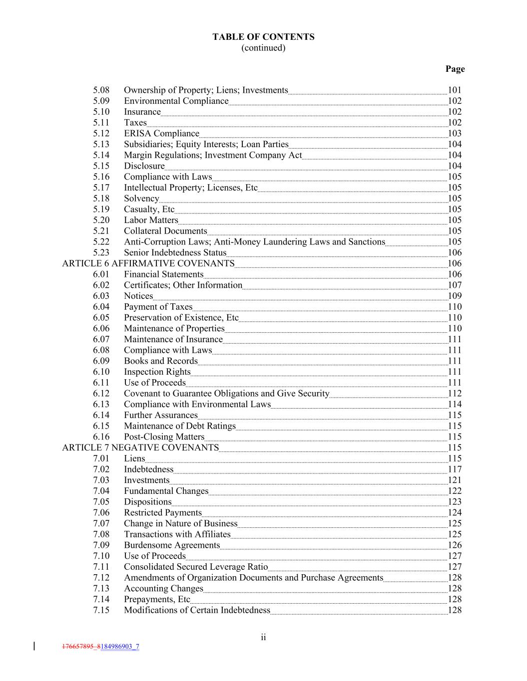 TABLE OF CONTENTS (continued) Page 5.08 Ownership of Property; Liens; Investments 101 5.09 Environmental Compliance 102 5.10 Insurance 102 5.11 Taxes 102 5.12 ERISA Compliance 103 5.13 Subsidiaries; Equity Interests; Loan Parties 104 5.14 Margin Regulations; Investment Company Act 104 5.15 Disclosure 104 5.16 Compliance with Laws 105 5.17 Intellectual Property; Licenses, Etc 105 5.18 Solvency 105 5.19 Casualty, Etc 105 5.20 Labor Matters 105 5.21 Collateral Documents 105 5.22 Anti-Corruption Laws; Anti-Money Laundering Laws and Sanctions 105 5.23 Senior Indebtedness Status 106 ARTICLE 6 AFFIRMATIVE COVENANTS 106 6.01 Financial Statements 106 6.02 Certificates; Other Information 107 6.03 Notices 109 6.04 Payment of Taxes 110 6.05 Preservation of Existence, Etc 110 6.06 Maintenance of Properties 110 6.07 Maintenance of Insurance 111 6.08 Compliance with Laws 111 6.09 Books and Records 111 6.10 Inspection Rights 111 6.11 Use of Proceeds 111 6.12 Covenant to Guarantee Obligations and Give Security 112 6.13 Compliance with Environmental Laws 114 6.14 Further Assurances 115 6.15 Maintenance of Debt Ratings 115 6.16 Post-Closing Matters 115 ARTICLE 7 NEGATIVE COVENANTS 115 7.01 Liens 115 7.02 Indebtedness 117 7.03 Investments 121 7.04 Fundamental Changes 122 7.05 Dispositions 123 7.06 Restricted Payments 124 7.07 Change in Nature of Business 125 7.08 Transactions with Affiliates 125 7.09 Burdensome Agreements 126 7.10 Use of Proceeds 127 7.11 Consolidated Secured Leverage Ratio 127 7.12 Amendments of Organization Documents and Purchase Agreements 128 7.13 Accounting Changes 128 7.14 Prepayments, Etc 128 7.15 Modifications of Certain Indebtedness 128 ii 176657895_8184986903_7