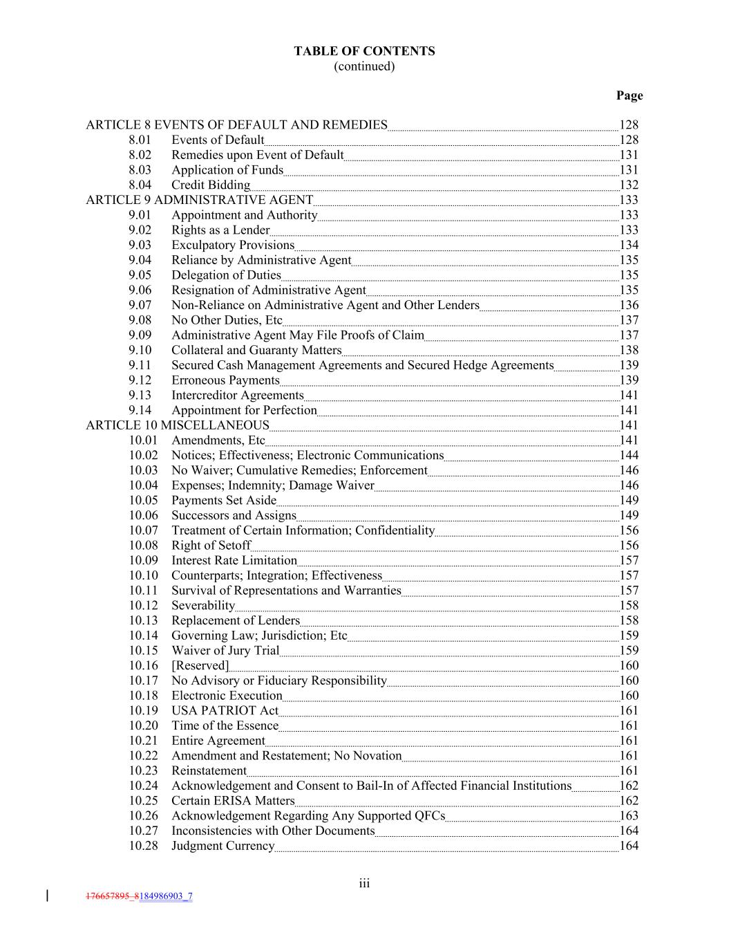 TABLE OF CONTENTS (continued) Page ARTICLE 8 EVENTS OF DEFAULT AND REMEDIES 128 8.01 Events of Default 128 8.02 Remedies upon Event of Default 131 8.03 Application of Funds 131 8.04 Credit Bidding 132 ARTICLE 9 ADMINISTRATIVE AGENT 133 9.01 Appointment and Authority 133 9.02 Rights as a Lender 133 9.03 Exculpatory Provisions 134 9.04 Reliance by Administrative Agent 135 9.05 Delegation of Duties 135 9.06 Resignation of Administrative Agent 135 9.07 Non-Reliance on Administrative Agent and Other Lenders 136 9.08 No Other Duties, Etc 137 9.09 Administrative Agent May File Proofs of Claim 137 9.10 Collateral and Guaranty Matters 138 9.11 Secured Cash Management Agreements and Secured Hedge Agreements 139 9.12 Erroneous Payments 139 9.13 Intercreditor Agreements 141 9.14 Appointment for Perfection 141 ARTICLE 10 MISCELLANEOUS 141 10.01 Amendments, Etc 141 10.02 Notices; Effectiveness; Electronic Communications 144 10.03 No Waiver; Cumulative Remedies; Enforcement 146 10.04 Expenses; Indemnity; Damage Waiver 146 10.05 Payments Set Aside 149 10.06 Successors and Assigns 149 10.07 Treatment of Certain Information; Confidentiality 156 10.08 Right of Setoff 156 10.09 Interest Rate Limitation 157 10.10 Counterparts; Integration; Effectiveness 157 10.11 Survival of Representations and Warranties 157 10.12 Severability 158 10.13 Replacement of Lenders 158 10.14 Governing Law; Jurisdiction; Etc 159 10.15 Waiver of Jury Trial 159 10.16 [Reserved] 160 10.17 No Advisory or Fiduciary Responsibility 160 10.18 Electronic Execution 160 10.19 USA PATRIOT Act 161 10.20 Time of the Essence 161 10.21 Entire Agreement 161 10.22 Amendment and Restatement; No Novation 161 10.23 Reinstatement 161 10.24 Acknowledgement and Consent to Bail-In of Affected Financial Institutions 162 10.25 Certain ERISA Matters 162 10.26 Acknowledgement Regarding Any Supported QFCs 163 10.27 Inconsistencies with Other Documents 164 10.28 Judgment Currency 164 iii 176657895_8184986903_7