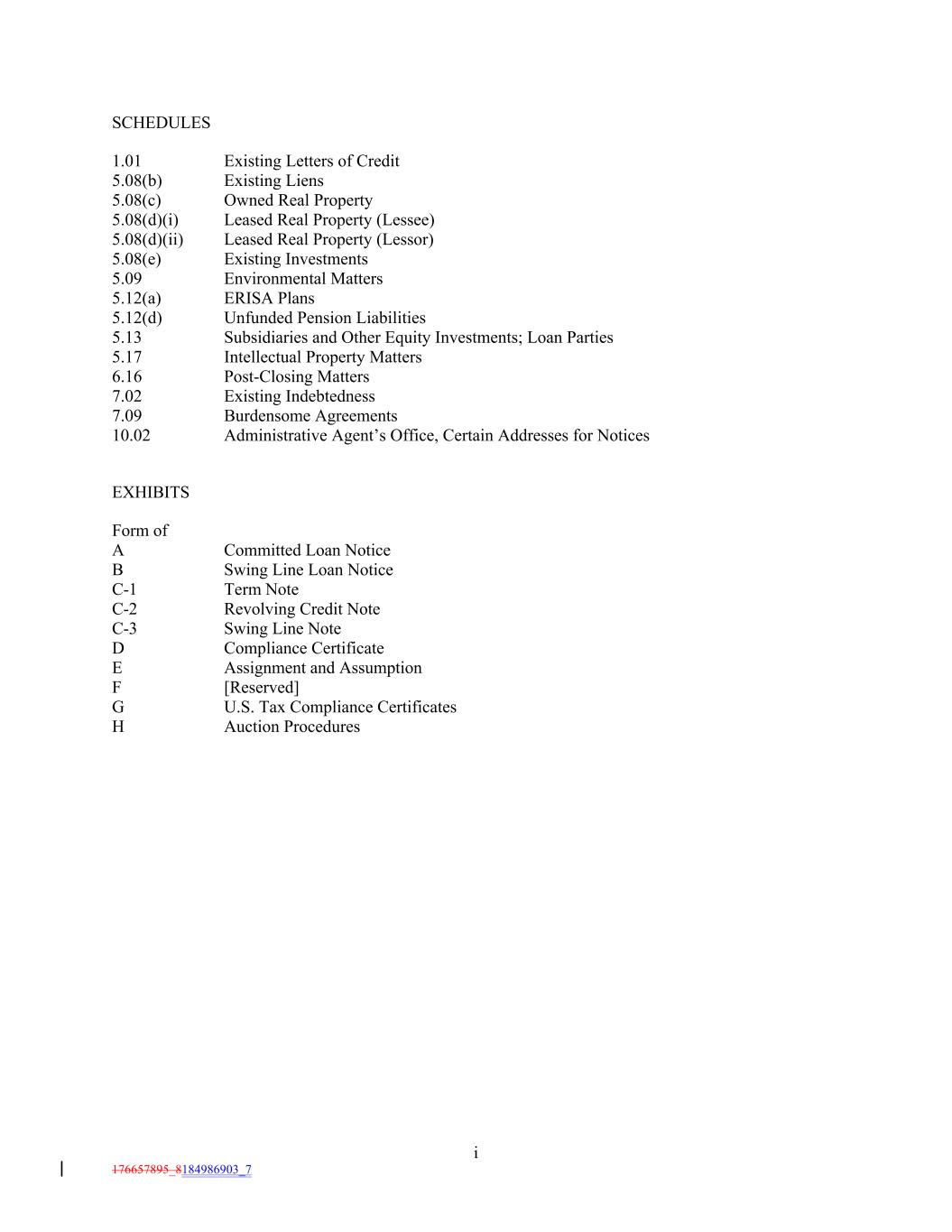 SCHEDULES 1.01 Existing Letters of Credit 5.08(b) Existing Liens 5.08(c) Owned Real Property 5.08(d)(i) Leased Real Property (Lessee) 5.08(d)(ii) Leased Real Property (Lessor) 5.08(e) Existing Investments 5.09 Environmental Matters 5.12(a) ERISA Plans 5.12(d) Unfunded Pension Liabilities 5.13 Subsidiaries and Other Equity Investments; Loan Parties 5.17 Intellectual Property Matters 6.16 Post-Closing Matters 7.02 Existing Indebtedness 7.09 Burdensome Agreements 10.02 Administrative Agent’s Office, Certain Addresses for Notices EXHIBITS Form of A Committed Loan Notice B Swing Line Loan Notice C-1 Term Note C-2 Revolving Credit Note C-3 Swing Line Note D Compliance Certificate E Assignment and Assumption F [Reserved] G U.S. Tax Compliance Certificates H Auction Procedures i 176657895_8184986903_7