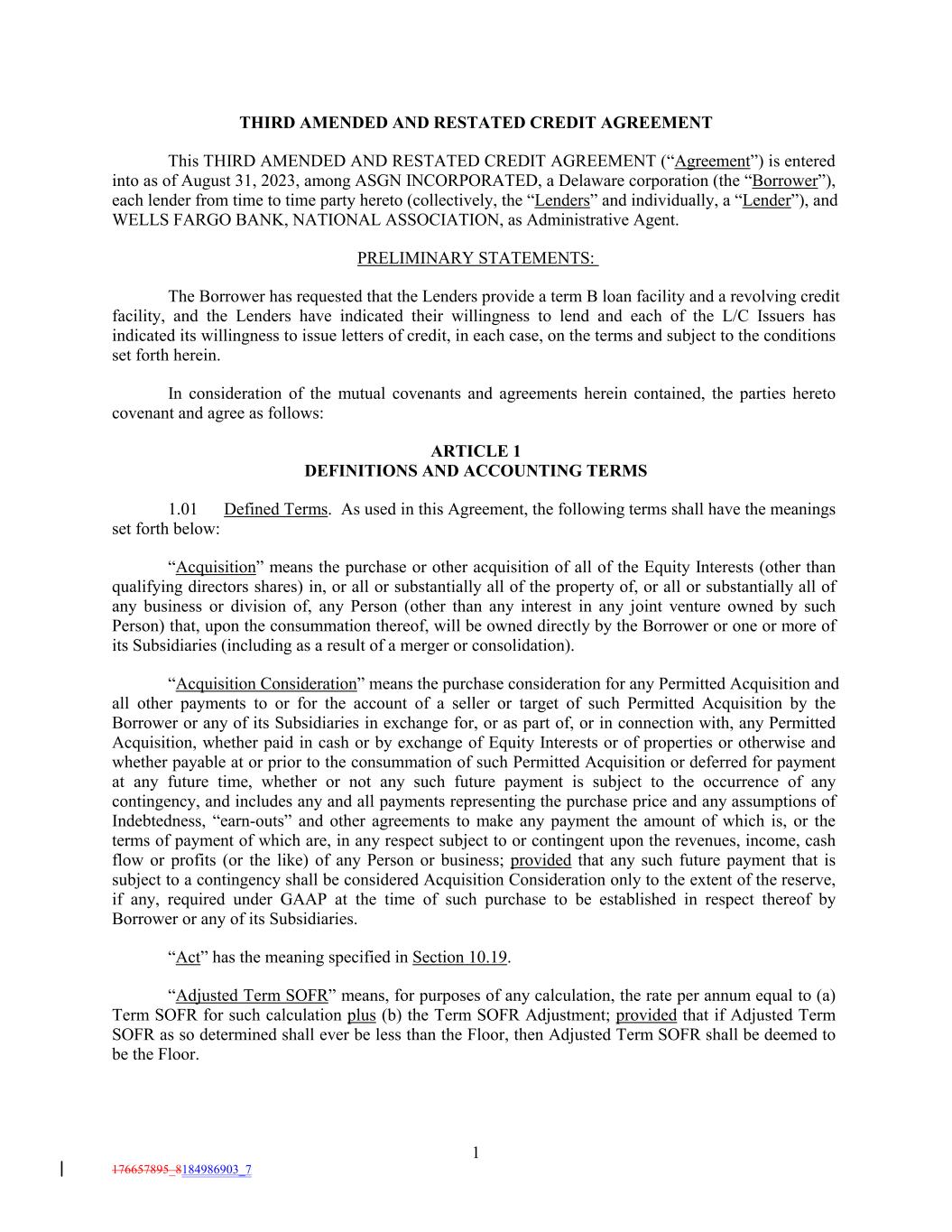 THIRD AMENDED AND RESTATED CREDIT AGREEMENT This THIRD AMENDED AND RESTATED CREDIT AGREEMENT (“Agreement”) is entered into as of August 31, 2023, among ASGN INCORPORATED, a Delaware corporation (the “Borrower”), each lender from time to time party hereto (collectively, the “Lenders” and individually, a “Lender”), and WELLS FARGO BANK, NATIONAL ASSOCIATION, as Administrative Agent. PRELIMINARY STATEMENTS: The Borrower has requested that the Lenders provide a term B loan facility and a revolving credit facility, and the Lenders have indicated their willingness to lend and each of the L/C Issuers has indicated its willingness to issue letters of credit, in each case, on the terms and subject to the conditions set forth herein. In consideration of the mutual covenants and agreements herein contained, the parties hereto covenant and agree as follows: ARTICLE 1 DEFINITIONS AND ACCOUNTING TERMS 1.01 Defined Terms. As used in this Agreement, the following terms shall have the meanings set forth below: “Acquisition” means the purchase or other acquisition of all of the Equity Interests (other than qualifying directors shares) in, or all or substantially all of the property of, or all or substantially all of any business or division of, any Person (other than any interest in any joint venture owned by such Person) that, upon the consummation thereof, will be owned directly by the Borrower or one or more of its Subsidiaries (including as a result of a merger or consolidation). “Acquisition Consideration” means the purchase consideration for any Permitted Acquisition and all other payments to or for the account of a seller or target of such Permitted Acquisition by the Borrower or any of its Subsidiaries in exchange for, or as part of, or in connection with, any Permitted Acquisition, whether paid in cash or by exchange of Equity Interests or of properties or otherwise and whether payable at or prior to the consummation of such Permitted Acquisition or deferred for payment at any future time, whether or not any such future payment is subject to the occurrence of any contingency, and includes any and all payments representing the purchase price and any assumptions of Indebtedness, “earn-outs” and other agreements to make any payment the amount of which is, or the terms of payment of which are, in any respect subject to or contingent upon the revenues, income, cash flow or profits (or the like) of any Person or business; provided that any such future payment that is subject to a contingency shall be considered Acquisition Consideration only to the extent of the reserve, if any, required under GAAP at the time of such purchase to be established in respect thereof by Borrower or any of its Subsidiaries. “Act” has the meaning specified in Section 10.19. “Adjusted Term SOFR” means, for purposes of any calculation, the rate per annum equal to (a) Term SOFR for such calculation plus (b) the Term SOFR Adjustment; provided that if Adjusted Term SOFR as so determined shall ever be less than the Floor, then Adjusted Term SOFR shall be deemed to be the Floor. 1 176657895_8184986903_7