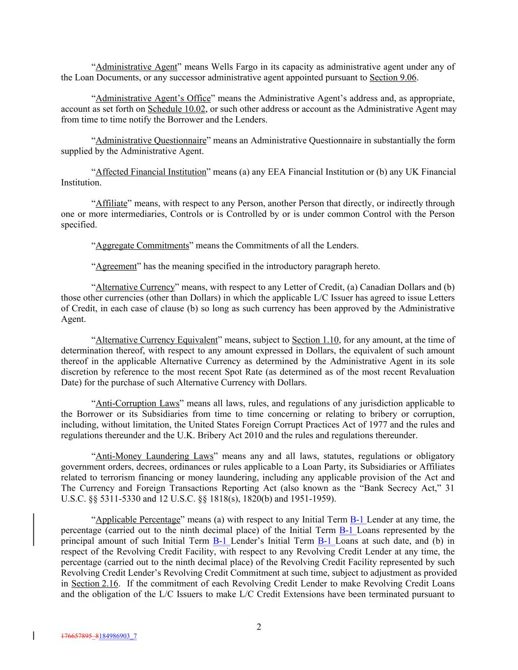 “Administrative Agent” means Wells Fargo in its capacity as administrative agent under any of the Loan Documents, or any successor administrative agent appointed pursuant to Section 9.06. “Administrative Agent’s Office” means the Administrative Agent’s address and, as appropriate, account as set forth on Schedule 10.02, or such other address or account as the Administrative Agent may from time to time notify the Borrower and the Lenders. “Administrative Questionnaire” means an Administrative Questionnaire in substantially the form supplied by the Administrative Agent. “Affected Financial Institution” means (a) any EEA Financial Institution or (b) any UK Financial Institution. “Affiliate” means, with respect to any Person, another Person that directly, or indirectly through one or more intermediaries, Controls or is Controlled by or is under common Control with the Person specified. “Aggregate Commitments” means the Commitments of all the Lenders. “Agreement” has the meaning specified in the introductory paragraph hereto. “Alternative Currency” means, with respect to any Letter of Credit, (a) Canadian Dollars and (b) those other currencies (other than Dollars) in which the applicable L/C Issuer has agreed to issue Letters of Credit, in each case of clause (b) so long as such currency has been approved by the Administrative Agent. “Alternative Currency Equivalent” means, subject to Section 1.10, for any amount, at the time of determination thereof, with respect to any amount expressed in Dollars, the equivalent of such amount thereof in the applicable Alternative Currency as determined by the Administrative Agent in its sole discretion by reference to the most recent Spot Rate (as determined as of the most recent Revaluation Date) for the purchase of such Alternative Currency with Dollars. “Anti-Corruption Laws” means all laws, rules, and regulations of any jurisdiction applicable to the Borrower or its Subsidiaries from time to time concerning or relating to bribery or corruption, including, without limitation, the United States Foreign Corrupt Practices Act of 1977 and the rules and regulations thereunder and the U.K. Bribery Act 2010 and the rules and regulations thereunder. “Anti-Money Laundering Laws” means any and all laws, statutes, regulations or obligatory government orders, decrees, ordinances or rules applicable to a Loan Party, its Subsidiaries or Affiliates related to terrorism financing or money laundering, including any applicable provision of the Act and The Currency and Foreign Transactions Reporting Act (also known as the “Bank Secrecy Act,” 31 U.S.C. §§ 5311-5330 and 12 U.S.C. §§ 1818(s), 1820(b) and 1951-1959). “Applicable Percentage” means (a) with respect to any Initial Term B-1 Lender at any time, the percentage (carried out to the ninth decimal place) of the Initial Term B-1 Loans represented by the principal amount of such Initial Term B-1 Lender’s Initial Term B-1 Loans at such date, and (b) in respect of the Revolving Credit Facility, with respect to any Revolving Credit Lender at any time, the percentage (carried out to the ninth decimal place) of the Revolving Credit Facility represented by such Revolving Credit Lender’s Revolving Credit Commitment at such time, subject to adjustment as provided in Section 2.16. If the commitment of each Revolving Credit Lender to make Revolving Credit Loans and the obligation of the L/C Issuers to make L/C Credit Extensions have been terminated pursuant to 2 176657895_8184986903_7