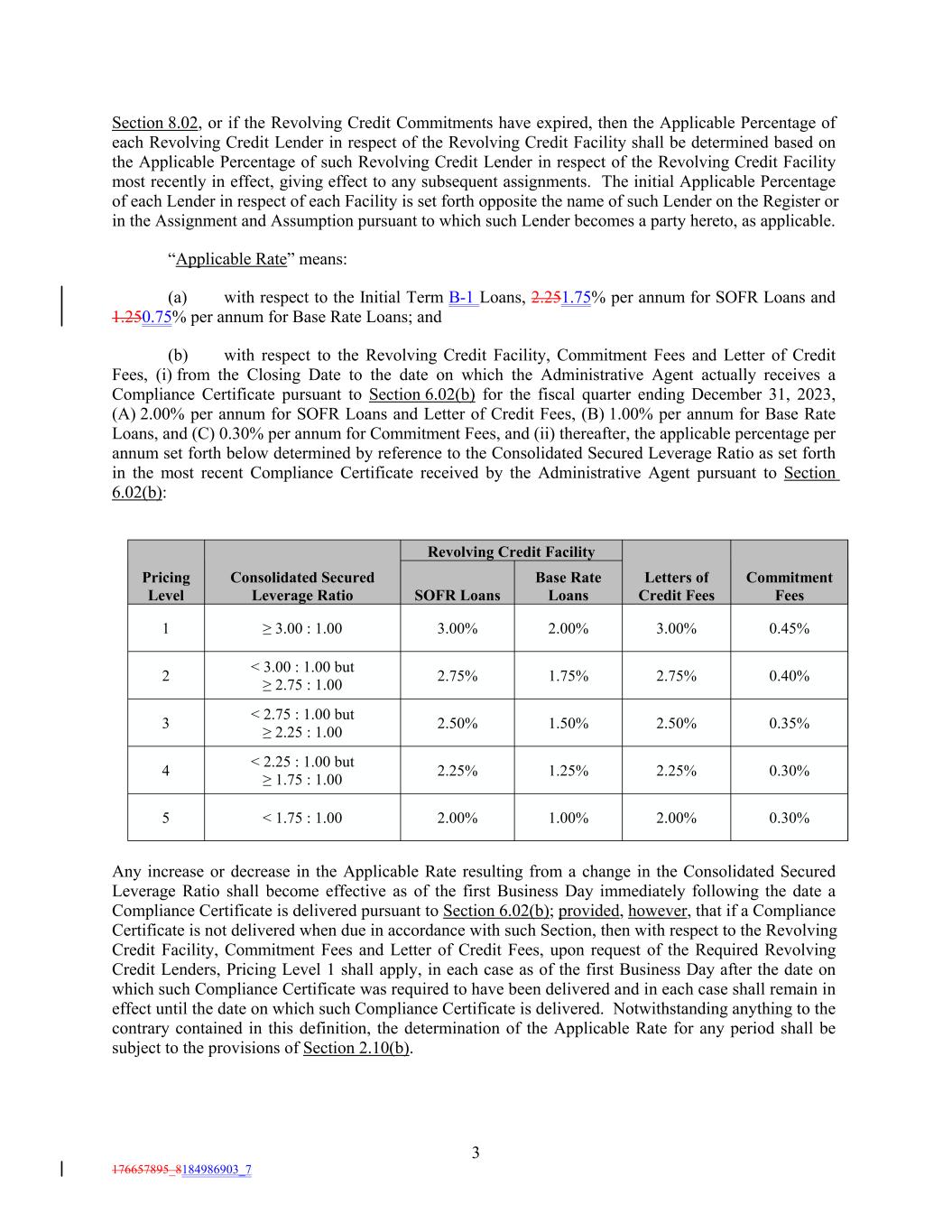 3 176657895_8184986903_7 2.75% Base Rate Loans 1.75% 2.75% 0.40% Letters of Credit Fees 3 < 2.75 : 1.00 but ≥ 2.25 : 1.00 2.50% Commitment Fees 1.50% 1 2.50% Pricing Level 0.35% ≥ 3.00 : 1.00 4 3.00% < 2.25 : 1.00 but ≥ 1.75 : 1.00 2.25% 2.00% 1.25% 2.25% 3.00% 0.30% Consolidated Secured Leverage Ratio 0.45% 5 < 1.75 : 1.00 2.00% Section 8.02, or if the Revolving Credit Commitments have expired, then the Applicable Percentage of each Revolving Credit Lender in respect of the Revolving Credit Facility shall be determined based on the Applicable Percentage of such Revolving Credit Lender in respect of the Revolving Credit Facility most recently in effect, giving effect to any subsequent assignments. The initial Applicable Percentage of each Lender in respect of each Facility is set forth opposite the name of such Lender on the Register or in the Assignment and Assumption pursuant to which such Lender becomes a party hereto, as applicable. “Applicable Rate” means: (a) with respect to the Initial Term B-1 Loans, 2.251.75% per annum for SOFR Loans and 1.250.75% per annum for Base Rate Loans; and (b) with respect to the Revolving Credit Facility, Commitment Fees and Letter of Credit Fees, (i) from the Closing Date to the date on which the Administrative Agent actually receives a Compliance Certificate pursuant to Section 6.02(b) for the fiscal quarter ending December 31, 2023, (A) 2.00% per annum for SOFR Loans and Letter of Credit Fees, (B) 1.00% per annum for Base Rate Loans, and (C) 0.30% per annum for Commitment Fees, and (ii) thereafter, the applicable percentage per annum set forth below determined by reference to the Consolidated Secured Leverage Ratio as set forth in the most recent Compliance Certificate received by the Administrative Agent pursuant to Section 6.02(b): 1.00% 2 2.00% SOFR Loans 0.30% < 3.00 : 1.00 but ≥ 2.75 : 1.00 Any increase or decrease in the Applicable Rate resulting from a change in the Consolidated Secured Leverage Ratio shall become effective as of the first Business Day immediately following the date a Compliance Certificate is delivered pursuant to Section 6.02(b); provided, however, that if a Compliance Certificate is not delivered when due in accordance with such Section, then with respect to the Revolving Credit Facility, Commitment Fees and Letter of Credit Fees, upon request of the Required Revolving Credit Lenders, Pricing Level 1 shall apply, in each case as of the first Business Day after the date on which such Compliance Certificate was required to have been delivered and in each case shall remain in effect until the date on which such Compliance Certificate is delivered. Notwithstanding anything to the contrary contained in this definition, the determination of the Applicable Rate for any period shall be subject to the provisions of Section 2.10(b). Revolving Credit Facility