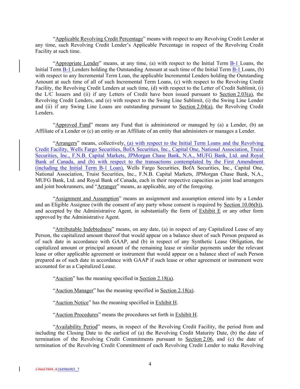 “Applicable Revolving Credit Percentage” means with respect to any Revolving Credit Lender at any time, such Revolving Credit Lender’s Applicable Percentage in respect of the Revolving Credit Facility at such time. “Appropriate Lender” means, at any time, (a) with respect to the Initial Term B-1 Loans, the Initial Term B-1 Lenders holding the Outstanding Amount at such time of the Initial Term B-1 Loans, (b) with respect to any Incremental Term Loan, the applicable Incremental Lenders holding the Outstanding Amount at such time of all of such Incremental Term Loans, (c) with respect to the Revolving Credit Facility, the Revolving Credit Lenders at such time, (d) with respect to the Letter of Credit Sublimit, (i) the L/C Issuers and (ii) if any Letters of Credit have been issued pursuant to Section 2.03(a), the Revolving Credit Lenders, and (e) with respect to the Swing Line Sublimit, (i) the Swing Line Lender and (ii) if any Swing Line Loans are outstanding pursuant to Section 2.04(a), the Revolving Credit Lenders. “Approved Fund” means any Fund that is administered or managed by (a) a Lender, (b) an Affiliate of a Lender or (c) an entity or an Affiliate of an entity that administers or manages a Lender. “Arrangers” means, collectively, (a) with respect to the Initial Term Loans and the Revolving Credit Facility, Wells Fargo Securities, BofA Securities, Inc., Capital One, National Association, Truist Securities, Inc., F.N.B. Capital Markets, JPMorgan Chase Bank, N.A., MUFG Bank, Ltd. and Royal Bank of Canada, and (b) with respect to the transactions contemplated by the First Amendment (including the Initial Term B-1 Loan), Wells Fargo Securities, BofA Securities, Inc., Capital One, National Association, Truist Securities, Inc., F.N.B. Capital Markets, JPMorgan Chase Bank, N.A., MUFG Bank, Ltd. and Royal Bank of Canada, each in their respective capacities as joint lead arrangers and joint bookrunners, and “Arranger” means, as applicable, any of the foregoing. “Assignment and Assumption” means an assignment and assumption entered into by a Lender and an Eligible Assignee (with the consent of any party whose consent is required by Section 10.06(b)), and accepted by the Administrative Agent, in substantially the form of Exhibit E or any other form approved by the Administrative Agent. “Attributable Indebtedness” means, on any date, (a) in respect of any Capitalized Lease of any Person, the capitalized amount thereof that would appear on a balance sheet of such Person prepared as of such date in accordance with GAAP, and (b) in respect of any Synthetic Lease Obligation, the capitalized amount or principal amount of the remaining lease or similar payments under the relevant lease or other applicable agreement or instrument that would appear on a balance sheet of such Person prepared as of such date in accordance with GAAP if such lease or other agreement or instrument were accounted for as a Capitalized Lease. “Auction” has the meaning specified in Section 2.18(a). “Auction Manager” has the meaning specified in Section 2.18(a). “Auction Notice” has the meaning specified in Exhibit H. “Auction Procedures” means the procedures set forth in Exhibit H. “Availability Period” means, in respect of the Revolving Credit Facility, the period from and including the Closing Date to the earliest of (a) the Revolving Credit Maturity Date, (b) the date of termination of the Revolving Credit Commitments pursuant to Section 2.06, and (c) the date of termination of the Revolving Credit Commitment of each Revolving Credit Lender to make Revolving 4 176657895_8184986903_7
