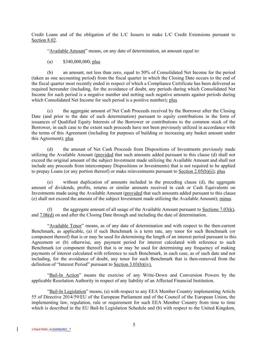 Credit Loans and of the obligation of the L/C Issuers to make L/C Credit Extensions pursuant to Section 8.02. “Available Amount” means, on any date of determination, an amount equal to: (a) $340,000,000; plus (b) an amount, not less than zero, equal to 50% of Consolidated Net Income for the period (taken as one accounting period) from the fiscal quarter in which the Closing Date occurs to the end of the fiscal quarter most recently ended in respect of which a Compliance Certificate has been delivered as required hereunder (including, for the avoidance of doubt, any periods during which Consolidated Net Income for such period is a negative number and netting such negative amounts against periods during which Consolidated Net Income for such period is a positive number); plus (c) the aggregate amount of Net Cash Proceeds received by the Borrower after the Closing Date (and prior to the date of such determination) pursuant to equity contributions in the form of issuances of Qualified Equity Interests of the Borrower or contributions to the common stock of the Borrower, in each case to the extent such proceeds have not been previously utilized in accordance with the terms of this Agreement (including for purposes of building or increasing any basket amount under this Agreement); plus (d) the amount of Net Cash Proceeds from Dispositions of Investments previously made utilizing the Available Amount (provided that such amounts added pursuant to this clause (d) shall not exceed the original amount of the subject Investment made utilizing the Available Amount and shall not include any proceeds from intercompany Dispositions or Investments) that is not required to be applied to prepay Loans (or any portion thereof) or make reinvestments pursuant to Section 2.05(b)(ii); plus (e) without duplication of amounts included in the preceding clause (d), the aggregate amount of dividends, profits, returns or similar amounts received in cash or Cash Equivalents on Investments made using the Available Amount (provided that such amounts added pursuant to this clause (e) shall not exceed the amount of the subject Investment made utilizing the Available Amount); minus (f) the aggregate amount of all usage of the Available Amount pursuant to Sections 7.03(k), and 7.06(d) on and after the Closing Date through and including the date of determination. “Available Tenor” means, as of any date of determination and with respect to the then-current Benchmark, as applicable, (a) if such Benchmark is a term rate, any tenor for such Benchmark (or component thereof) that is or may be used for determining the length of an interest period pursuant to this Agreement or (b) otherwise, any payment period for interest calculated with reference to such Benchmark (or component thereof) that is or may be used for determining any frequency of making payments of interest calculated with reference to such Benchmark, in each case, as of such date and not including, for the avoidance of doubt, any tenor for such Benchmark that is then-removed from the definition of “Interest Period” pursuant to Section 3.03(b)(iv). “Bail-In Action” means the exercise of any Write-Down and Conversion Powers by the applicable Resolution Authority in respect of any liability of an Affected Financial Institution. “Bail-In Legislation” means, (a) with respect to any EEA Member Country implementing Article 55 of Directive 2014/59/EU of the European Parliament and of the Council of the European Union, the implementing law, regulation, rule or requirement for such EEA Member Country from time to time which is described in the EU Bail-In Legislation Schedule and (b) with respect to the United Kingdom, 5 176657895_8184986903_7