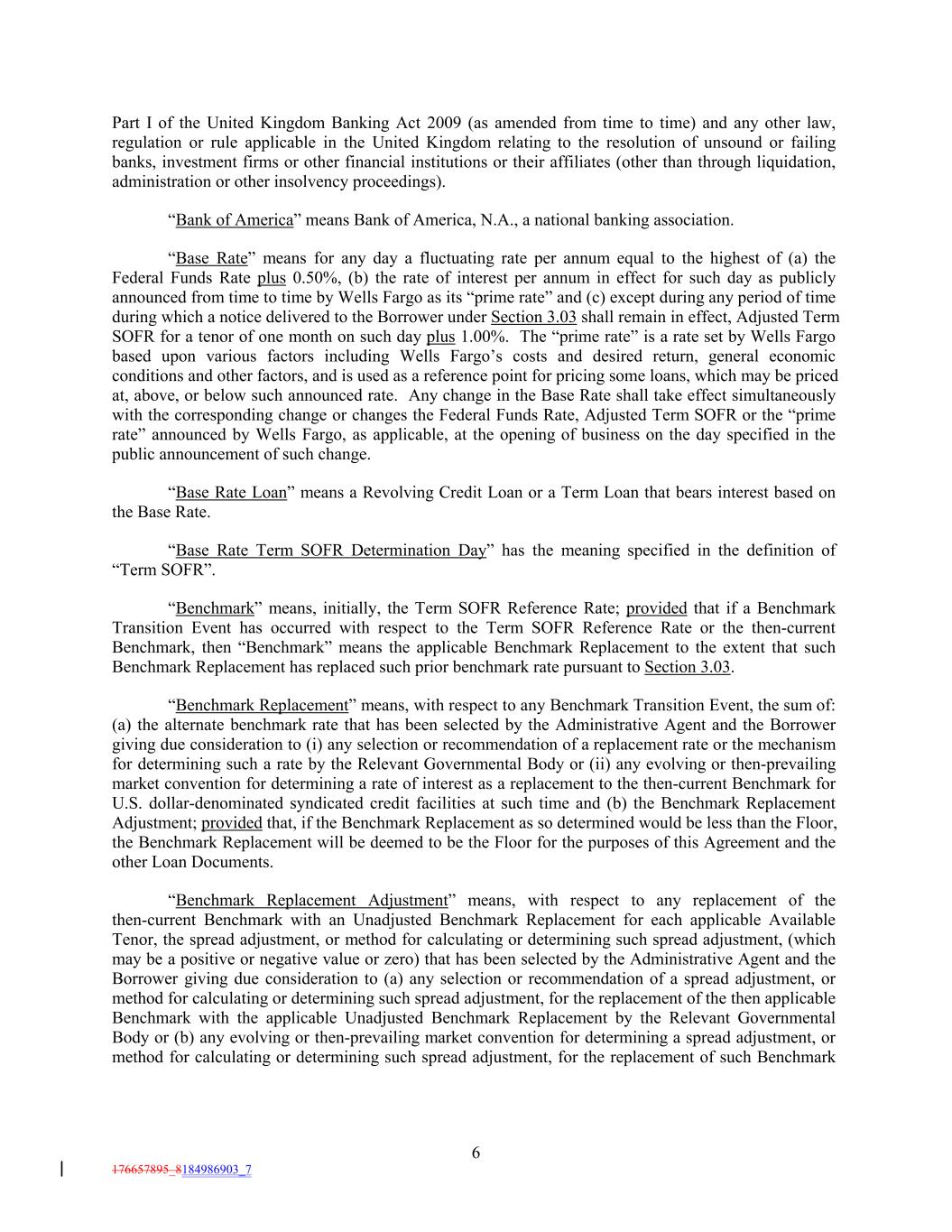 Part I of the United Kingdom Banking Act 2009 (as amended from time to time) and any other law, regulation or rule applicable in the United Kingdom relating to the resolution of unsound or failing banks, investment firms or other financial institutions or their affiliates (other than through liquidation, administration or other insolvency proceedings). “Bank of America” means Bank of America, N.A., a national banking association. “Base Rate” means for any day a fluctuating rate per annum equal to the highest of (a) the Federal Funds Rate plus 0.50%, (b) the rate of interest per annum in effect for such day as publicly announced from time to time by Wells Fargo as its “prime rate” and (c) except during any period of time during which a notice delivered to the Borrower under Section 3.03 shall remain in effect, Adjusted Term SOFR for a tenor of one month on such day plus 1.00%. The “prime rate” is a rate set by Wells Fargo based upon various factors including Wells Fargo’s costs and desired return, general economic conditions and other factors, and is used as a reference point for pricing some loans, which may be priced at, above, or below such announced rate. Any change in the Base Rate shall take effect simultaneously with the corresponding change or changes the Federal Funds Rate, Adjusted Term SOFR or the “prime rate” announced by Wells Fargo, as applicable, at the opening of business on the day specified in the public announcement of such change. “Base Rate Loan” means a Revolving Credit Loan or a Term Loan that bears interest based on the Base Rate. “Base Rate Term SOFR Determination Day” has the meaning specified in the definition of “Term SOFR”. “Benchmark” means, initially, the Term SOFR Reference Rate; provided that if a Benchmark Transition Event has occurred with respect to the Term SOFR Reference Rate or the then-current Benchmark, then “Benchmark” means the applicable Benchmark Replacement to the extent that such Benchmark Replacement has replaced such prior benchmark rate pursuant to Section 3.03. “Benchmark Replacement” means, with respect to any Benchmark Transition Event, the sum of: (a) the alternate benchmark rate that has been selected by the Administrative Agent and the Borrower giving due consideration to (i) any selection or recommendation of a replacement rate or the mechanism for determining such a rate by the Relevant Governmental Body or (ii) any evolving or then-prevailing market convention for determining a rate of interest as a replacement to the then-current Benchmark for U.S. dollar-denominated syndicated credit facilities at such time and (b) the Benchmark Replacement Adjustment; provided that, if the Benchmark Replacement as so determined would be less than the Floor, the Benchmark Replacement will be deemed to be the Floor for the purposes of this Agreement and the other Loan Documents. “Benchmark Replacement Adjustment” means, with respect to any replacement of the then-current Benchmark with an Unadjusted Benchmark Replacement for each applicable Available Tenor, the spread adjustment, or method for calculating or determining such spread adjustment, (which may be a positive or negative value or zero) that has been selected by the Administrative Agent and the Borrower giving due consideration to (a) any selection or recommendation of a spread adjustment, or method for calculating or determining such spread adjustment, for the replacement of the then applicable Benchmark with the applicable Unadjusted Benchmark Replacement by the Relevant Governmental Body or (b) any evolving or then-prevailing market convention for determining a spread adjustment, or method for calculating or determining such spread adjustment, for the replacement of such Benchmark 6 176657895_8184986903_7