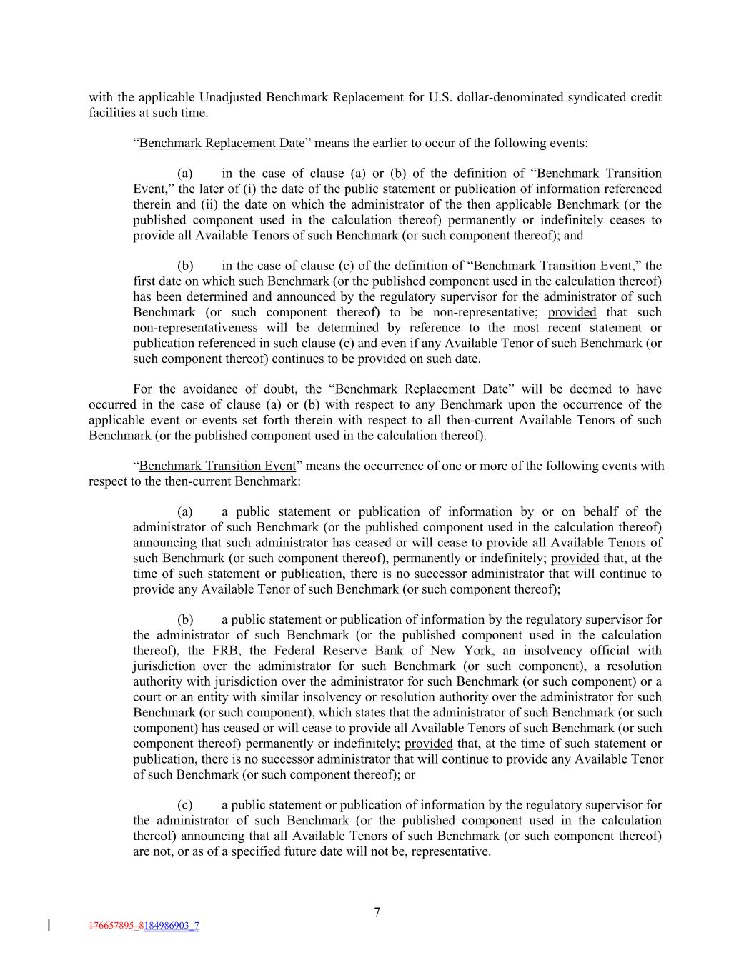 with the applicable Unadjusted Benchmark Replacement for U.S. dollar-denominated syndicated credit facilities at such time. “Benchmark Replacement Date” means the earlier to occur of the following events: (a) in the case of clause (a) or (b) of the definition of “Benchmark Transition Event,” the later of (i) the date of the public statement or publication of information referenced therein and (ii) the date on which the administrator of the then applicable Benchmark (or the published component used in the calculation thereof) permanently or indefinitely ceases to provide all Available Tenors of such Benchmark (or such component thereof); and (b) in the case of clause (c) of the definition of “Benchmark Transition Event,” the first date on which such Benchmark (or the published component used in the calculation thereof) has been determined and announced by the regulatory supervisor for the administrator of such Benchmark (or such component thereof) to be non-representative; provided that such non-representativeness will be determined by reference to the most recent statement or publication referenced in such clause (c) and even if any Available Tenor of such Benchmark (or such component thereof) continues to be provided on such date. For the avoidance of doubt, the “Benchmark Replacement Date” will be deemed to have occurred in the case of clause (a) or (b) with respect to any Benchmark upon the occurrence of the applicable event or events set forth therein with respect to all then-current Available Tenors of such Benchmark (or the published component used in the calculation thereof). “Benchmark Transition Event” means the occurrence of one or more of the following events with respect to the then-current Benchmark: (a) a public statement or publication of information by or on behalf of the administrator of such Benchmark (or the published component used in the calculation thereof) announcing that such administrator has ceased or will cease to provide all Available Tenors of such Benchmark (or such component thereof), permanently or indefinitely; provided that, at the time of such statement or publication, there is no successor administrator that will continue to provide any Available Tenor of such Benchmark (or such component thereof); (b) a public statement or publication of information by the regulatory supervisor for the administrator of such Benchmark (or the published component used in the calculation thereof), the FRB, the Federal Reserve Bank of New York, an insolvency official with jurisdiction over the administrator for such Benchmark (or such component), a resolution authority with jurisdiction over the administrator for such Benchmark (or such component) or a court or an entity with similar insolvency or resolution authority over the administrator for such Benchmark (or such component), which states that the administrator of such Benchmark (or such component) has ceased or will cease to provide all Available Tenors of such Benchmark (or such component thereof) permanently or indefinitely; provided that, at the time of such statement or publication, there is no successor administrator that will continue to provide any Available Tenor of such Benchmark (or such component thereof); or (c) a public statement or publication of information by the regulatory supervisor for the administrator of such Benchmark (or the published component used in the calculation thereof) announcing that all Available Tenors of such Benchmark (or such component thereof) are not, or as of a specified future date will not be, representative. 7 176657895_8184986903_7