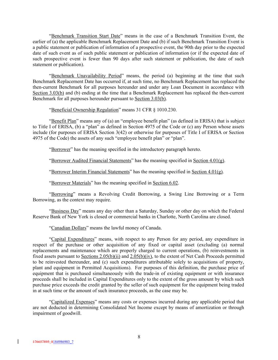 “Benchmark Transition Start Date” means in the case of a Benchmark Transition Event, the earlier of (a) the applicable Benchmark Replacement Date and (b) if such Benchmark Transition Event is a public statement or publication of information of a prospective event, the 90th day prior to the expected date of such event as of such public statement or publication of information (or if the expected date of such prospective event is fewer than 90 days after such statement or publication, the date of such statement or publication). “Benchmark Unavailability Period” means, the period (a) beginning at the time that such Benchmark Replacement Date has occurred if, at such time, no Benchmark Replacement has replaced the then-current Benchmark for all purposes hereunder and under any Loan Document in accordance with Section 3.03(b) and (b) ending at the time that a Benchmark Replacement has replaced the then-current Benchmark for all purposes hereunder pursuant to Section 3.03(b). “Beneficial Ownership Regulation” means 31 CFR § 1010.230. “Benefit Plan” means any of (a) an “employee benefit plan” (as defined in ERISA) that is subject to Title I of ERISA, (b) a “plan” as defined in Section 4975 of the Code or (c) any Person whose assets include (for purposes of ERISA Section 3(42) or otherwise for purposes of Title I of ERISA or Section 4975 of the Code) the assets of any such “employee benefit plan” or “plan”. “Borrower” has the meaning specified in the introductory paragraph hereto. “Borrower Audited Financial Statements” has the meaning specified in Section 4.01(g). “Borrower Interim Financial Statements” has the meaning specified in Section 4.01(g). “Borrower Materials” has the meaning specified in Section 6.02. “Borrowing” means a Revolving Credit Borrowing, a Swing Line Borrowing or a Term Borrowing, as the context may require. “Business Day” means any day other than a Saturday, Sunday or other day on which the Federal Reserve Bank of New York is closed or commercial banks in Charlotte, North Carolina are closed. “Canadian Dollars” means the lawful money of Canada. “Capital Expenditures” means, with respect to any Person for any period, any expenditure in respect of the purchase or other acquisition of any fixed or capital asset (excluding (a) normal replacements and maintenance which are properly charged to current operations, (b) reinvestments in fixed assets pursuant to Sections 2.05(b)(ii) and 2.05(b)(iv), to the extent of Net Cash Proceeds permitted to be reinvested thereunder, and (c) such expenditures attributable solely to acquisitions of property, plant and equipment in Permitted Acquisitions). For purposes of this definition, the purchase price of equipment that is purchased simultaneously with the trade-in of existing equipment or with insurance proceeds shall be included in Capital Expenditures only to the extent of the gross amount by which such purchase price exceeds the credit granted by the seller of such equipment for the equipment being traded in at such time or the amount of such insurance proceeds, as the case may be. “Capitalized Expenses” means any costs or expenses incurred during any applicable period that are not deducted in determining Consolidated Net Income except by means of amortization or through impairment of goodwill. 8 176657895_8184986903_7